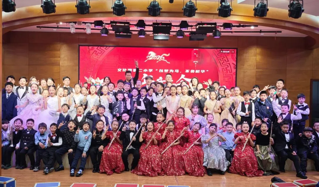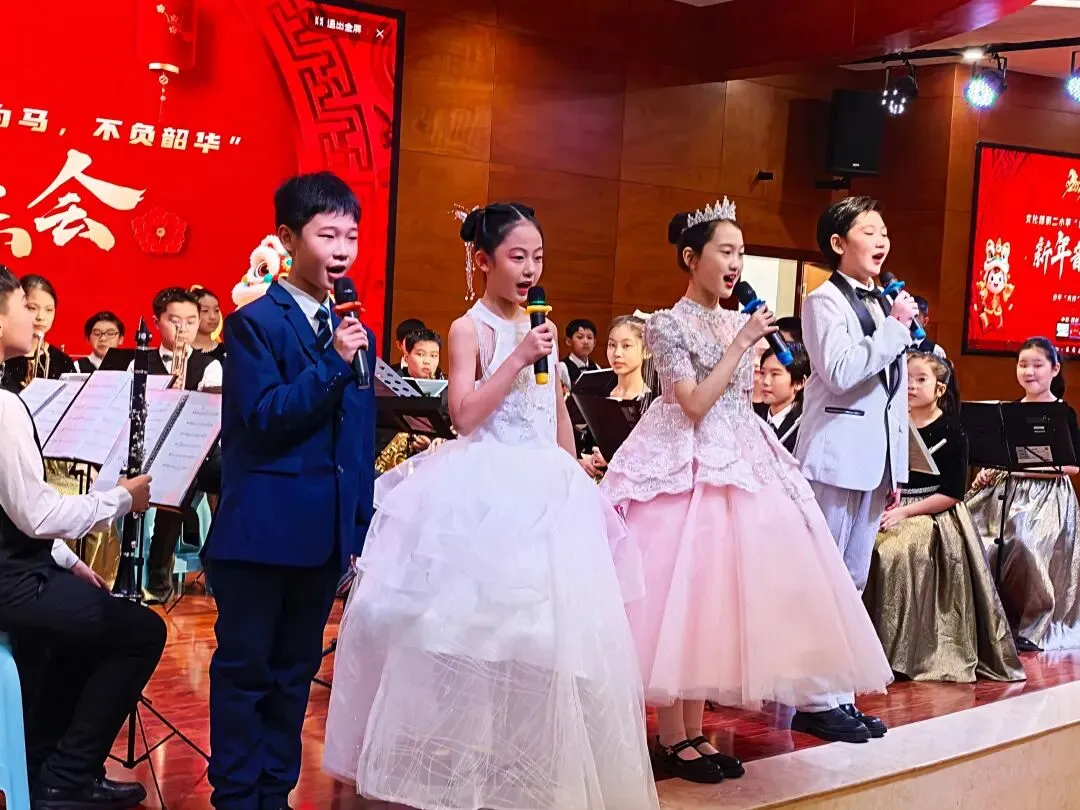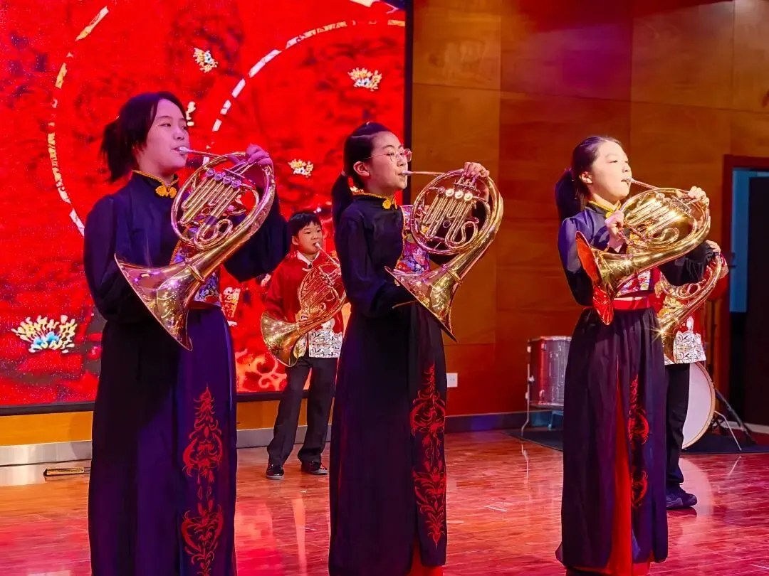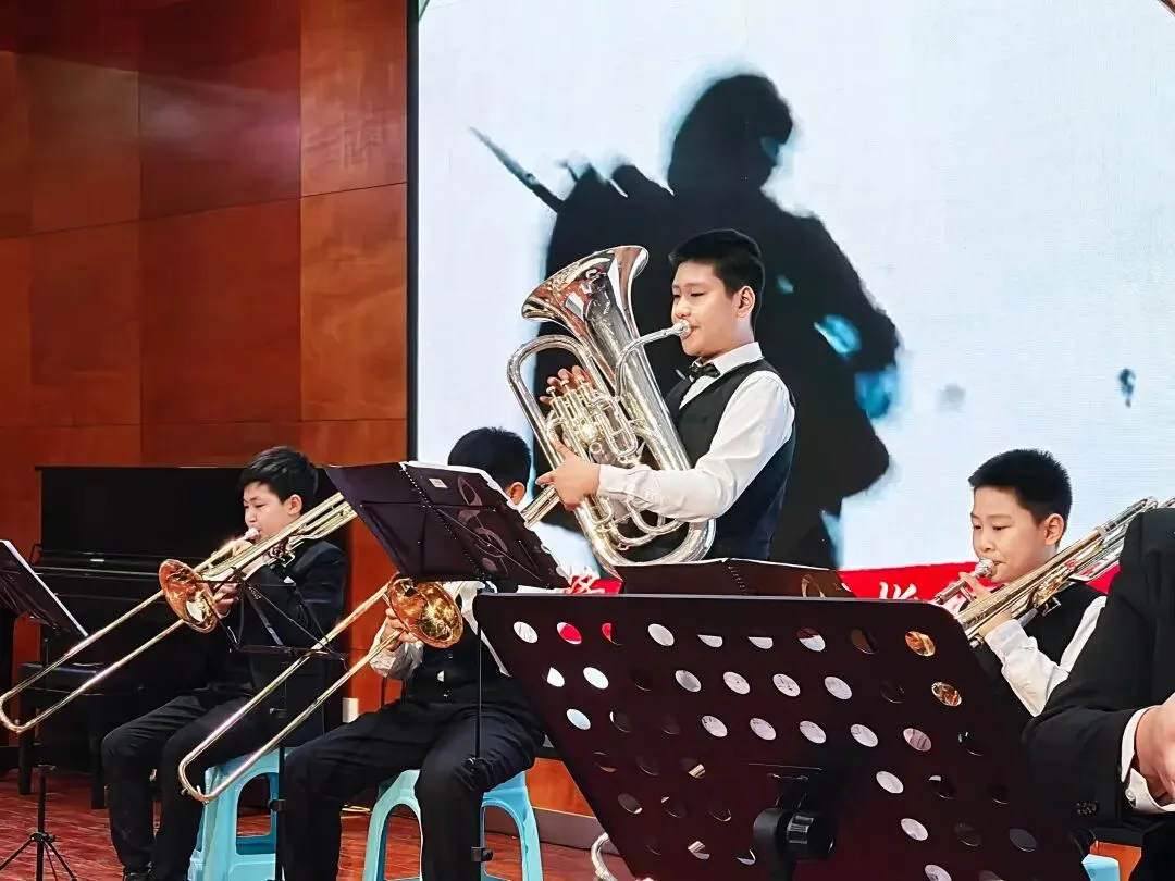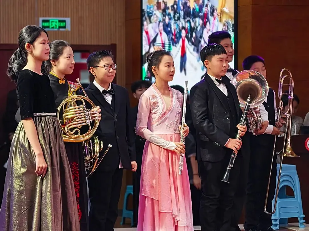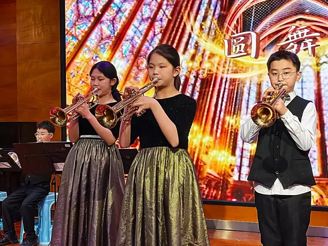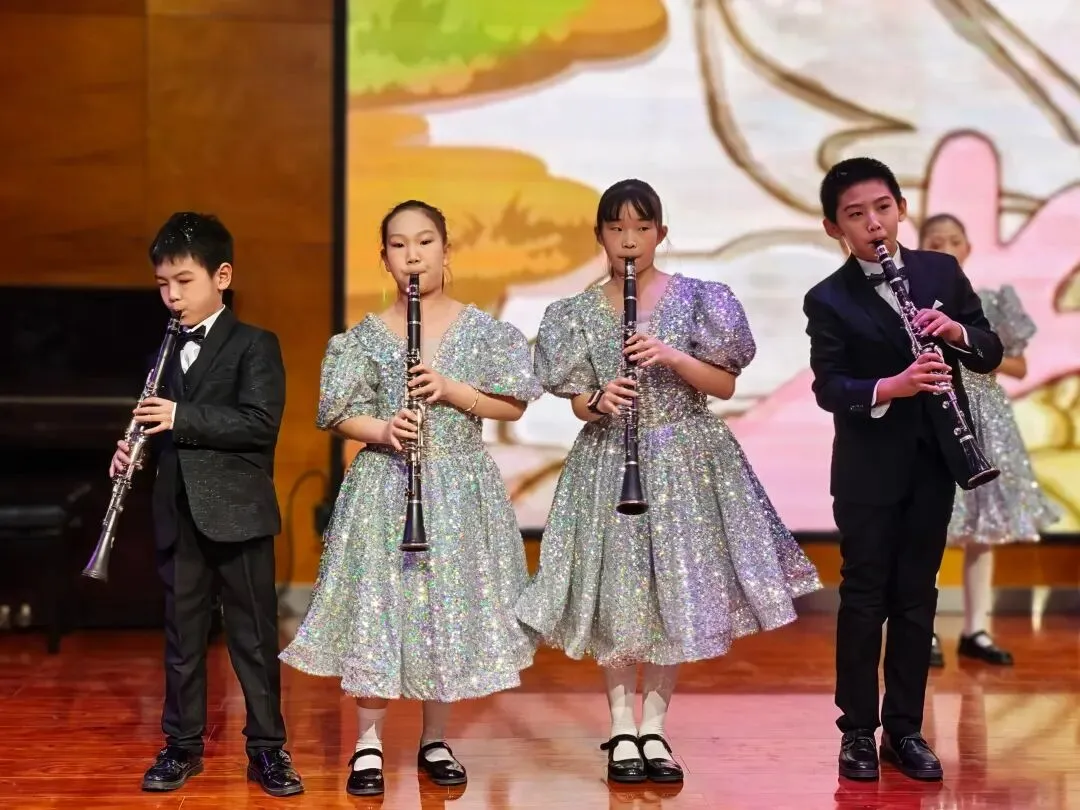 此外,小号独奏《圆舞曲》优雅浪漫,单簧管演绎的《大家一起喜羊羊》童趣盎然,圆号版《雪龙吟》大气磅礴,打击乐《刀马刀马》《离别开出花》则以多变的节奏点燃现场,每一首曲目都展现了孩子们扎实的演奏功底与对音乐的热爱。