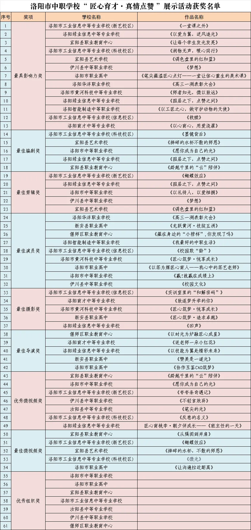 在获奖的短视频中,宜阳县职业教育中心短视频《让每个学生发光发亮》荣获“最具影响力奖”,《跨越千里的“云”陪伴》荣获“最佳编剧奖”和“优秀微视频奖”,《从隔阂到并肩》荣获“最佳微视频奖”,学校荣获优秀组织奖。