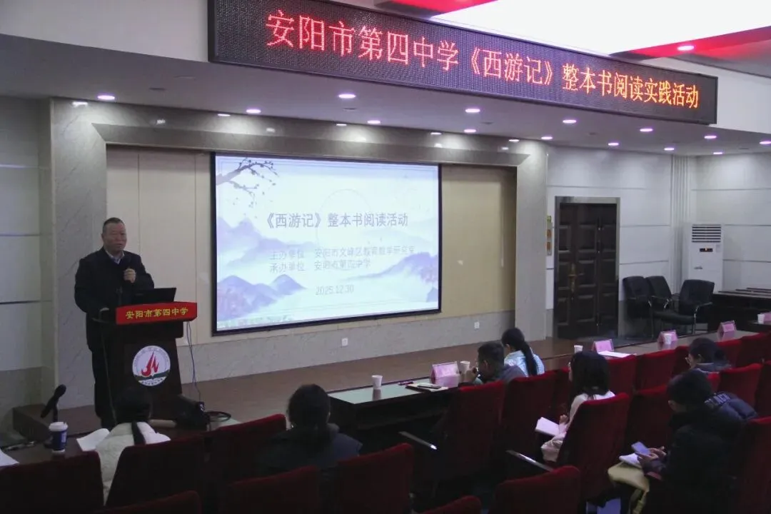 为深入推动区域整本书阅读教学实践,探索名著阅读的有效路径,12月30日下午,由文峰区教研室主办、安阳市第四中学承办的“《西游记》整本书阅读教学研讨活动”成功举行。本次活动汇聚了区教育局领导、教研室领导、四中校领导、兄弟学校教师代表及本校语文教师,通过致辞、经验分享、课例展示、专题报告等多种形式,展开了深入的教学研讨与交流。