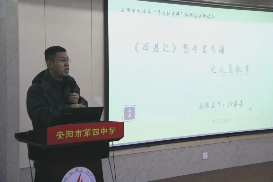 为深入推动区域整本书阅读教学实践,探索名著阅读的有效路径,12月30日下午,由文峰区教研室主办、安阳市第四中学承办的“《西游记》整本书阅读教学研讨活动”成功举行。本次活动汇聚了区教育局领导、教研室领导、四中校领导、兄弟学校教师代表及本校语文教师,通过致辞、经验分享、课例展示、专题报告等多种形式,展开了深入的教学研讨与交流。