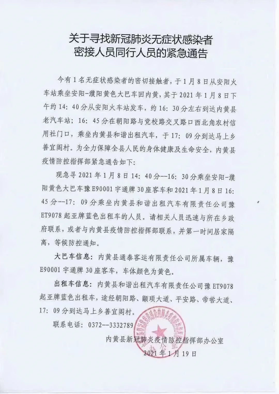 现急寻2021年1月8日14∶40分--16∶30分乘坐安阳-濮阳黄色大巴车豫E90001宇通牌 30座客车和2021年1月8日16∶ 45 分--17∶ 09 分乘坐内黄县和谐出租汽车有限责任公司豫 ET9078 起亚牌蓝色出租车的人员。请相关人员迅速与所在乡政府联系,或者与内黄县疫情防控指挥部联系,并第一时间居家隔离,等候防控通知。