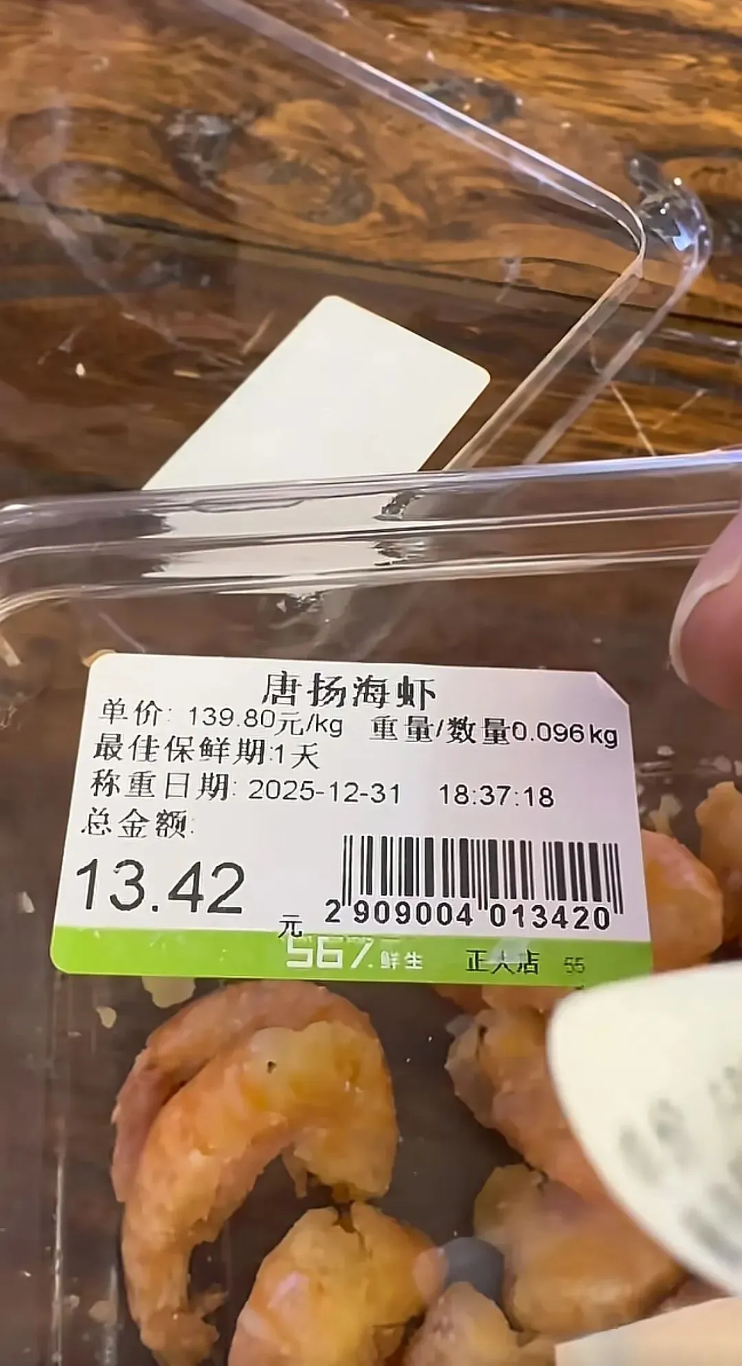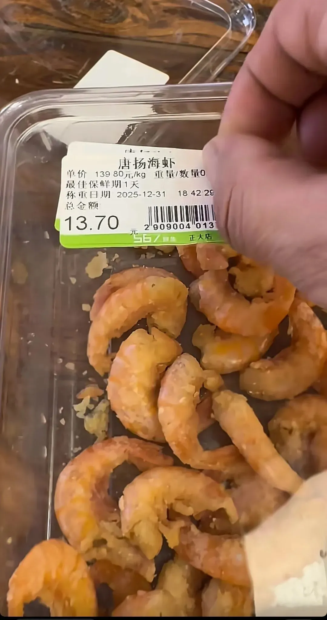 今天早上刷视频,刷到了一条洛阳网友发,是说12月31晚在洛龙区正大567鲜生买了一盒唐扬海虾,标签上称重日期是12月31日18:42分,价格13.7元。