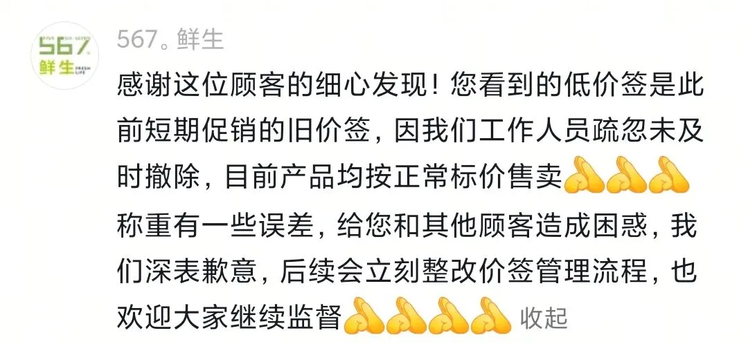 本以为标签只是员工打错,没想到567鲜生客服回复说低价签是短期促销,后来的是按正常标价售卖,称重有一些误差。