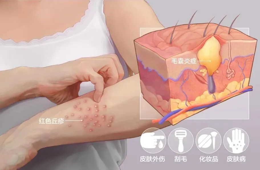 毛囊口会出现针尖到米粒大小的红色丘疹或脓疱,有时中心会有一根毛发穿过,伴随瘙痒、疼痛或按压痛。