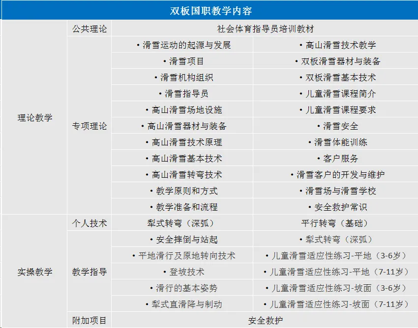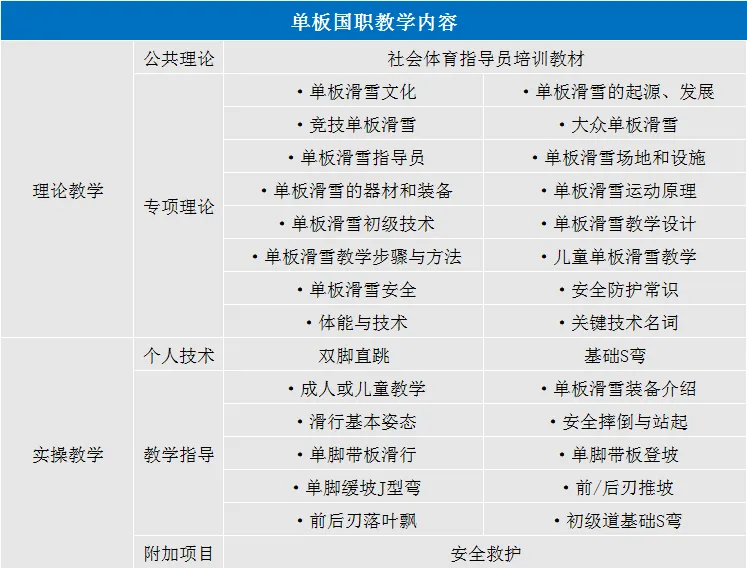 1.滑雪运动概述;2.场地设施器材及装备;3.教学原则与教学方法;4.基础、初级技术的种类、含义、动作要领及应用范围;5.教学流程:重点在适应、基础和初级技术练习顺序、内容与场地;6.单板场地、器材及装备;7.运动损伤;8.客户服务;9.指导员义务、职责和素质。