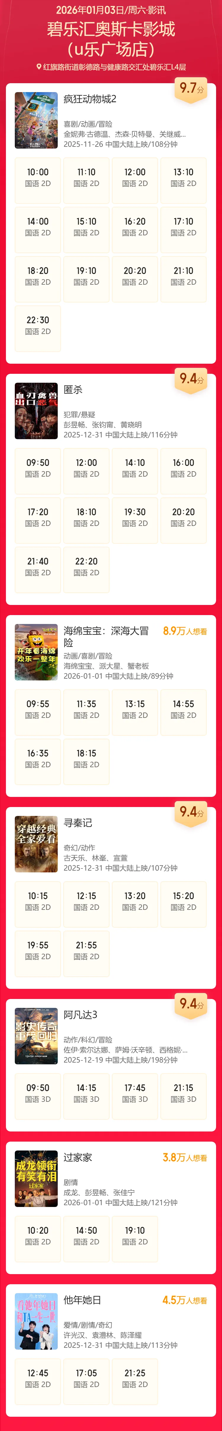 >安阳碧乐汇奥斯卡影城1月3日影讯(影讯仅供参考,具体排片以影院当日播出为准)