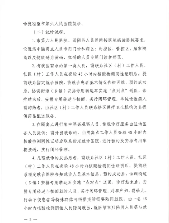 1.市第六人民医院、汤阴县人民医院按医院感染防控要求,设置集中隔离点人员专用门诊和病区;封控区、管控区、居家隔离以及健康码为黄码、红码的人员专用门诊和病区。