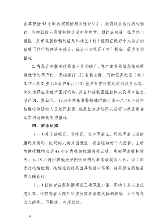 (一)处于封控区、管控区、集中隔离点、居家隔离以及健康码为黄码、红码的人员外出就医,要全程做好个人防护,主动向医疗机构出示48小时内核酸检测阴性证明、告知隔离管控情况。无48小时内核酸检测阴性证明的非急诊就医人员,须立即进行核酸检测,核酸检测结果出具前耐心等候,结果报告阴性后再入院诊疗。