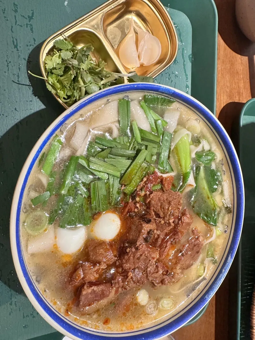 上桌时常配一小碟香菜、辣椒油、糖蒜。先喝汤品鲜,再大口吃面,最后糖蒜清口解腻。