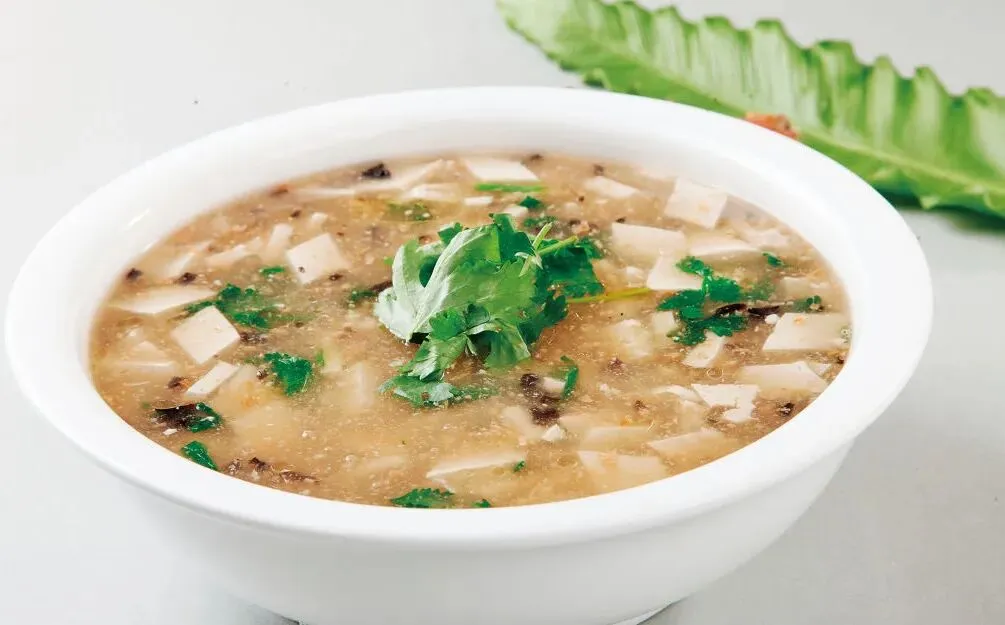 现磨花生豆腐汤(嫩豆腐30克,老豆腐30克,粉条15克,青菜30克,花生10克)
