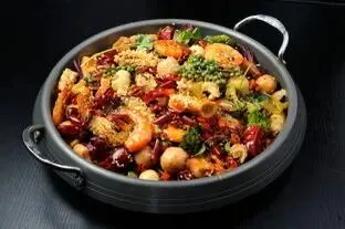 麻酱香锅(肥牛30克,鹌鹑蛋22克,猪肉小酥肉60克,海带30克,豆腐皮30克,青菜50克)