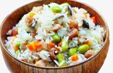 腊肠焖饭(腊肠50克,大米200克,胡萝卜20克,蒜苔20克,玉米20克)