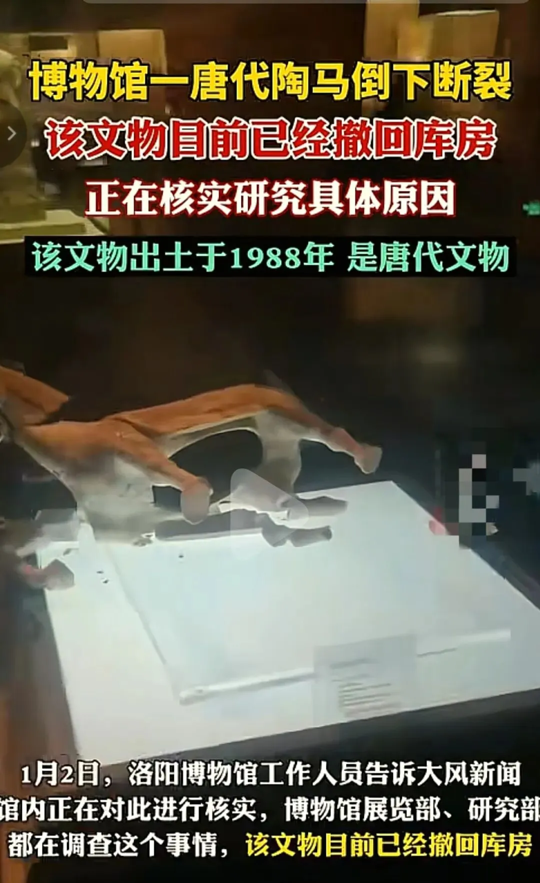 近日,一则关于洛阳博物馆珍贵文物受损的消息引发广泛关注。据网友发布的图片显示,一件唐代鎏金陶马在展柜内倒地,两条马腿发生断裂,现场情况令人揪心。这件于1988年在偃师市出土的陶马,距今已有一千余年历史,其艺术与历史价值不言而喻。