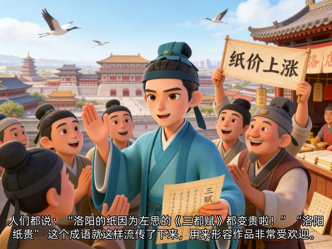 西晋时期,有个叫左思的年轻人,他从小不爱说话,但心里却有大大的梦想 —— 写出一部让所有人都称赞的好书。左思长大后,听说班固和张衡分别写了《两都赋》和《二京赋》,非常佩服,决定也要写一篇描写都城的赋,题目就叫《三都赋》。为了写好《三都赋》,左思到处收集资料,他拜访老人,查阅书籍,连走路时都在思考文章的句子。他在书房里一待就是一整天,饿了就啃几口馒头,困了就趴在桌上打个盹,桌上的纸堆得越来越高,墨水瓶也换了一个又一个。朋友们看到左思这么辛苦,都劝他:“写赋太难了,你还是放弃吧!” 可左思摇摇头,继续埋头写作。就这样过了十年,左思终于写完了《三都赋》!他看着厚厚的文稿,激动得流下了眼泪。可是,当左思把《三都赋》拿给别人看时,很多文人都嘲笑他:“一个无名小卒,还想写赋?”著名文学家张华看了《三都赋》后,大加赞赏:“这篇赋写得太好了!可以和《两都赋》《二京赋》相比!”张华的推荐让《三都赋》一下子出名了,洛阳城里的文人雅士都争着传抄,纸店的纸很快就卖光了。人们都说:“洛阳的纸因为左思的《三都赋》都变贵啦!”“洛阳纸贵” 这个成语就这样流传了下来,用来形容作品非常受欢迎。