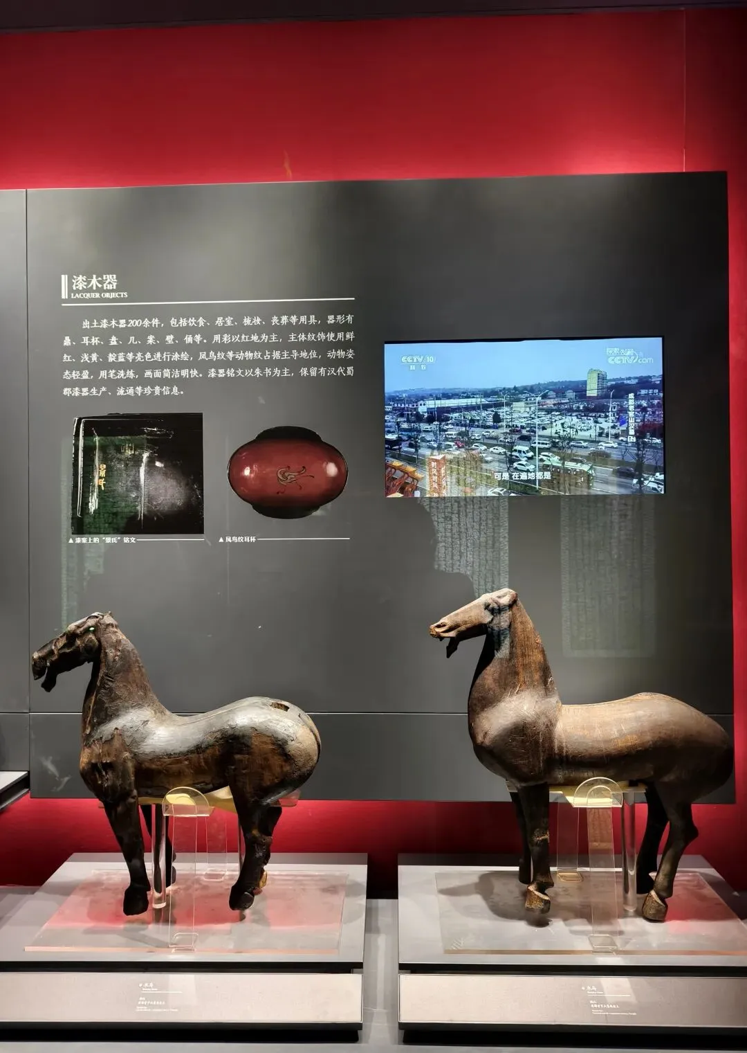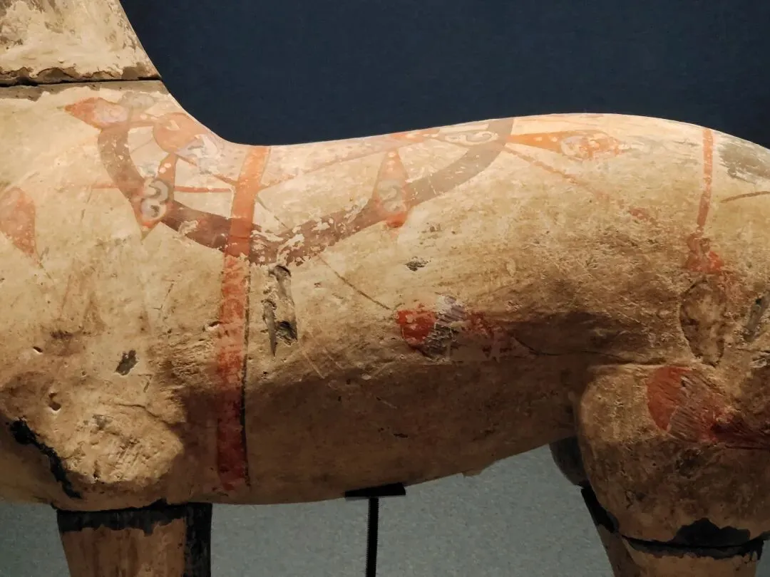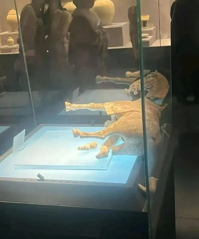 唐代彩绘“抬腿陶马”疑似是另外一件,住集体宿舍(在边柜陈列)的:明明出事的是1988年4月偃师市政府招待所出土的“彩绘贴金陶马”,为什么在《情况说明》里要写成“彩绘抬腿陶马”呢?有朋友说,在边柜展出的2001年洛阳文教局拨交的唐代“抬腿陶马”是二级文物,在独立展柜展出的1988年4月偃师市政府招待所出土的唐代“彩绘贴金陶马”是一级文物。《情况说明》在众目睽睽之下张冠李戴,其实是指鹿为马、狸猫换太子,把出事的一级文物换成了二级文物。后续万一追责,可以光明正大理直气壮降一等。为什么看到消息的第一时间我的反应是“马身没支撑,马腿承重过载”了呢?给你们看别的博物馆、考古文博单位小心周全陈列的范例。2025年3月19日我去成都考古中心参观。成都老官山汉墓出土的漆木马,那里是这样陈列的:还是成都考古中心。羊安汉墓出土铜车马,是这样陈列的: