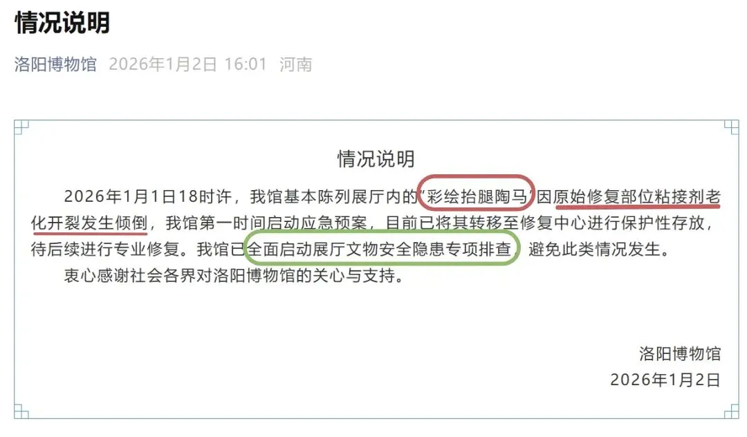 2026年1月1日下午6点左右,洛阳博物馆常设展上的一匹唐代陶马众目睽睽之下腿碎了,倾倒了。2日下午4点,洛阳博物馆发布了《情况说明》,确认确有此事,说明原因是原始修复部位粘接剂老化开裂,文物已经从展线上撤下来收好,将来再修。博物馆也启动了对展厅文物安全隐患的全面排查,避免再碎倒一个。但是,文物的名称却对不上:倒下的是1988年4月偃师市政府招待所出土唐代“彩绘贴金陶马”,《情况说明》里写的是(疑似)2001年洛阳文教局拨交的唐代彩绘“抬腿陶马”。不知其中是否另有隐情?2026年1月1日下午,洛阳博物馆一独立展柜里的唐代陶马突然腿碎了,倒向右侧。当时博物馆尚未闭馆,很多参观者都在场。1月1日20:31,有人在网上发布了消息并配了现场图:“心疼三秒:洛博唯一的鎏金马,玉碎了!马年第1天,这匹来自大唐的鎏金马,以玉碎的方式,趟(躺)平了,下岗了,越狱了!......许是累了,或者是天意,在马年的第1天,万马奔腾的日子里,他想退隐江湖!在观众拥挤的目光中,他猝不及防的倒下了。”