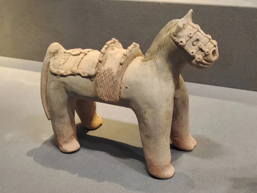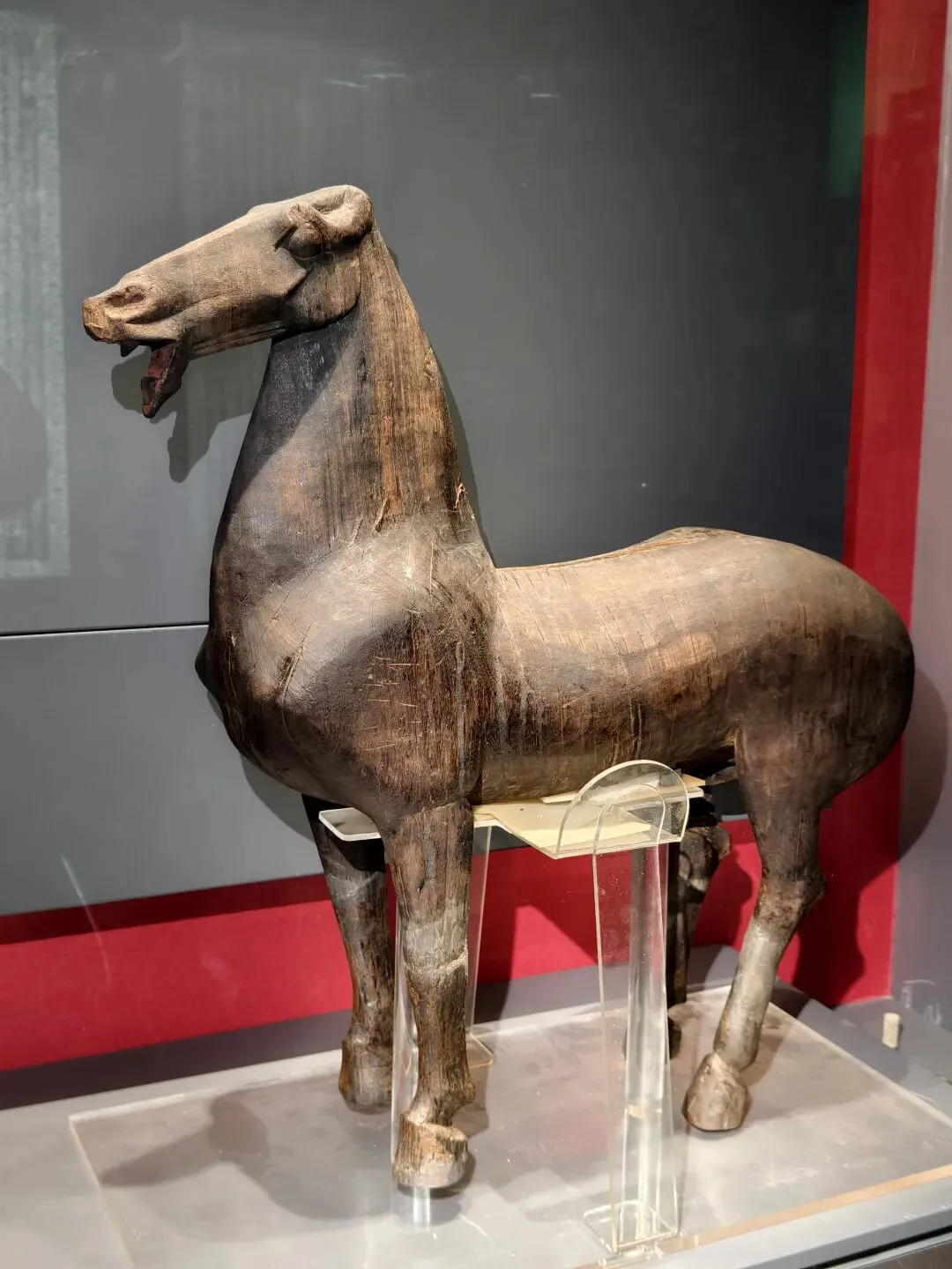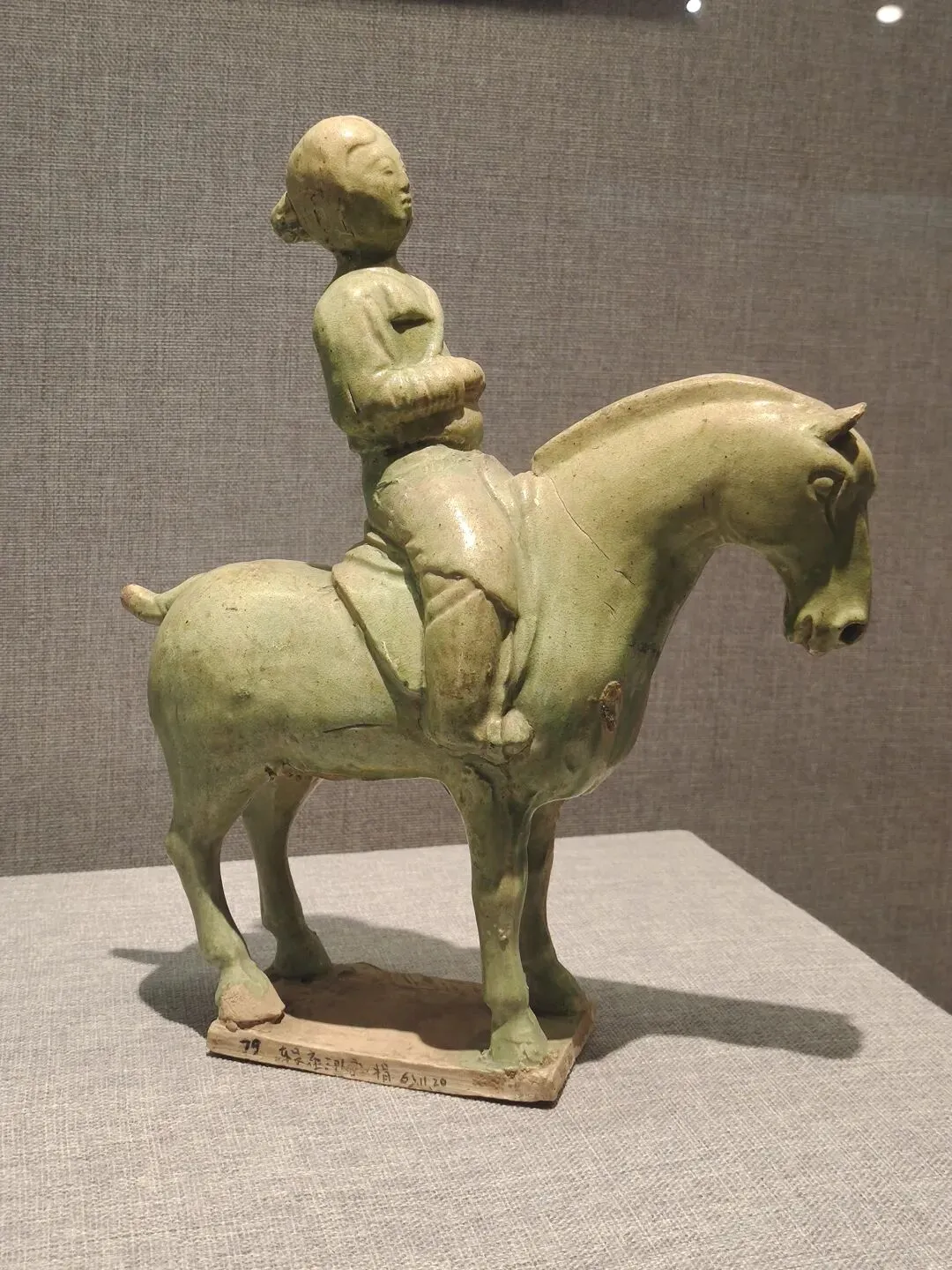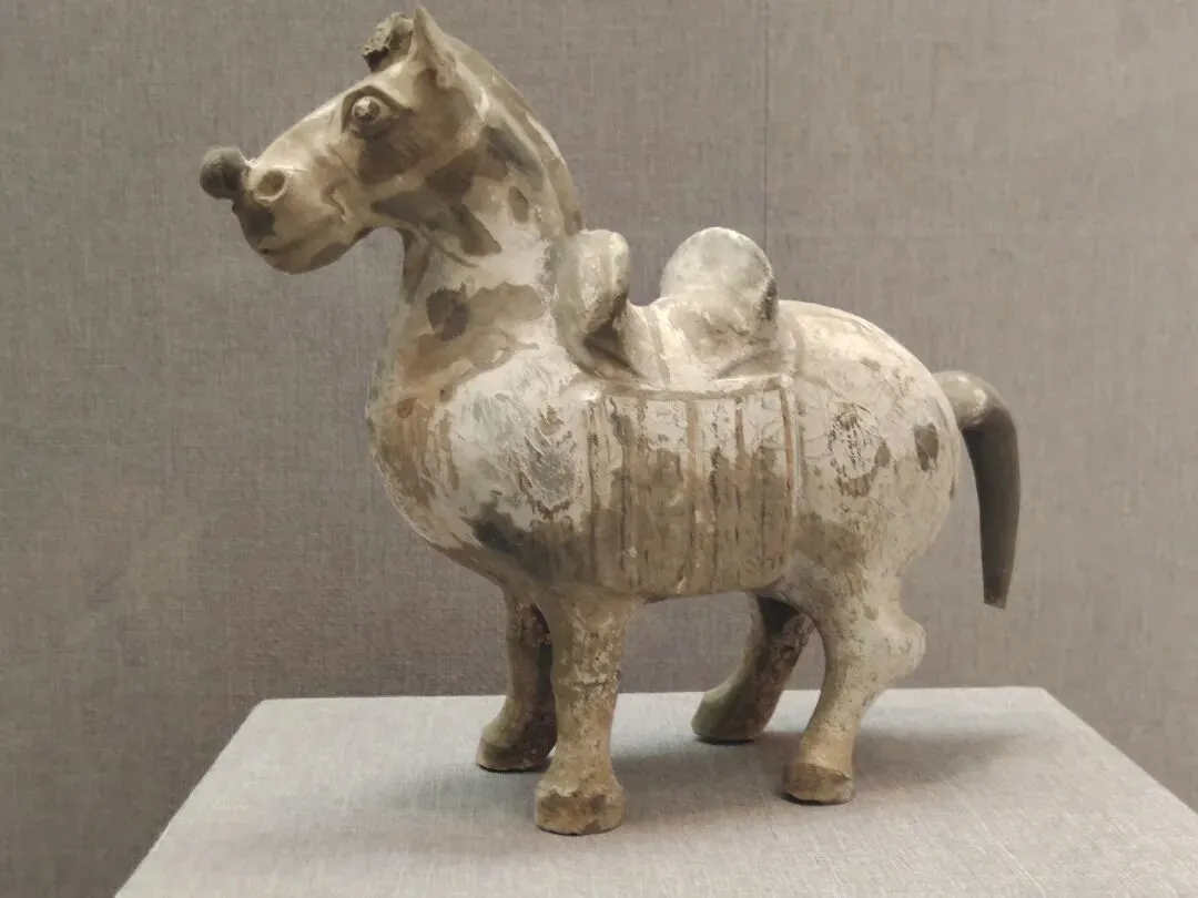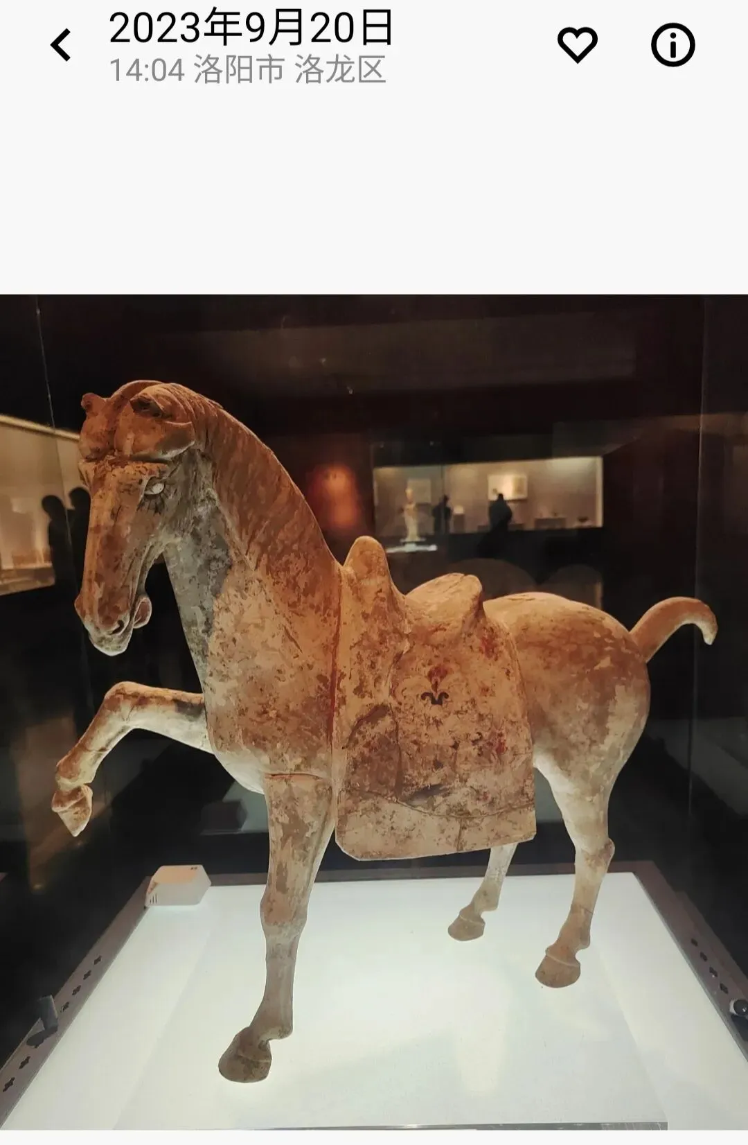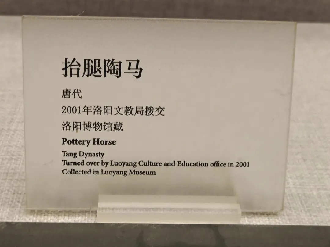144字的说明,主要说了五点内容:④出事文物已经从展线撤了下来,暂时放起来了,以后再修;⑤已“全面启动展厅文物安全隐患专项排查”,检查展线上所有文物的粘接情况,文物不能再倒了。首先,发布及时。事发元旦假期中,1日18点快下班时事发,20点网络舆情发酵,2日16点发布,四舍五入算是8小时内完成涉事文物处置、汇报请示走流程、舆情评估、拟稿发稿。最早发消息的网友还删帖了。这个危机公关,可谓娴熟专业高效,可圈可点;其次,态度敞亮。当然了,事情在众目睽睽之下发生的,网上有图有真相,否认是不可能的。况且又不是人为因素。老老实实承认,比什么都强;其三,事因合理。陶俑出土时碎成N块,修复就是拼碎块、粘合、修补。粘接剂老化是专业技术层面的课题,又不是博物馆的过错。对老百姓来说,是完全可以理解也可以接受的。说实话,看到洛阳博物馆那么快就坦坦荡荡公开回应,我还挺欣慰甚至挺羡慕的。有同行衬托,洛阳博物馆的危机公关能力、博物馆面对公众的基本网络素养明显强出一大截。说实话,文博爱好者的2025年的岁尾真是够糟心的了:南京博物院的硕鼠监守自盗让人瞠目结舌;金坛区博物馆珍贵文物展线上放个复制品,不注明不说,还信誓旦旦说展的就是原件,要看的都来看吧。本来,我觉得,2026开年第一天就发生了这么一桩敞敞亮亮、健康互动的事,挺好的,洛阳博物馆的表现,让人对文博事业与公众的互动和共赢继续保持信心。元旦我走亲访友去了,没顾上关心此事。2号回家翻出旧手机,充上电,开机打开相册,回顾了一下里边2023年看展拍的照片。——嗯,你没看错:我看展拍的照片就放在手机相册里,换了新手机,旧手机里的照片就不管了。实话说吧,我就像个下蛋的母鸡,下完就一边咯咯哒一边往前走,不回头不管昨天的蛋的~2023年9月下旬,我曾经往洛阳看过几天展,洛阳博物馆、周天子驾六博物馆、洛阳古墓博物馆、二里头夏都遗址博物馆等都有去。曾经看过洛阳博物馆出事故的这匹马: