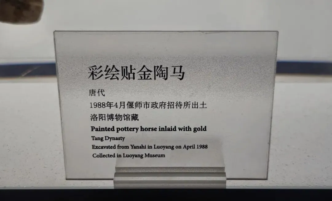 对照事故现场图片,我框出来的地方,应该就是这次断裂的地方,而且,马脖子那个粘合的地方应该确实也断裂开了。我也有拍这件陶马的展签。展签信息显示,它不是网传的“鎏金”陶马,也不是洛阳博物馆《情况说明》里写的“彩绘抬腿陶马”,而是“彩绘贴金陶马”,1988年4月偃师市政府招待所出土:
