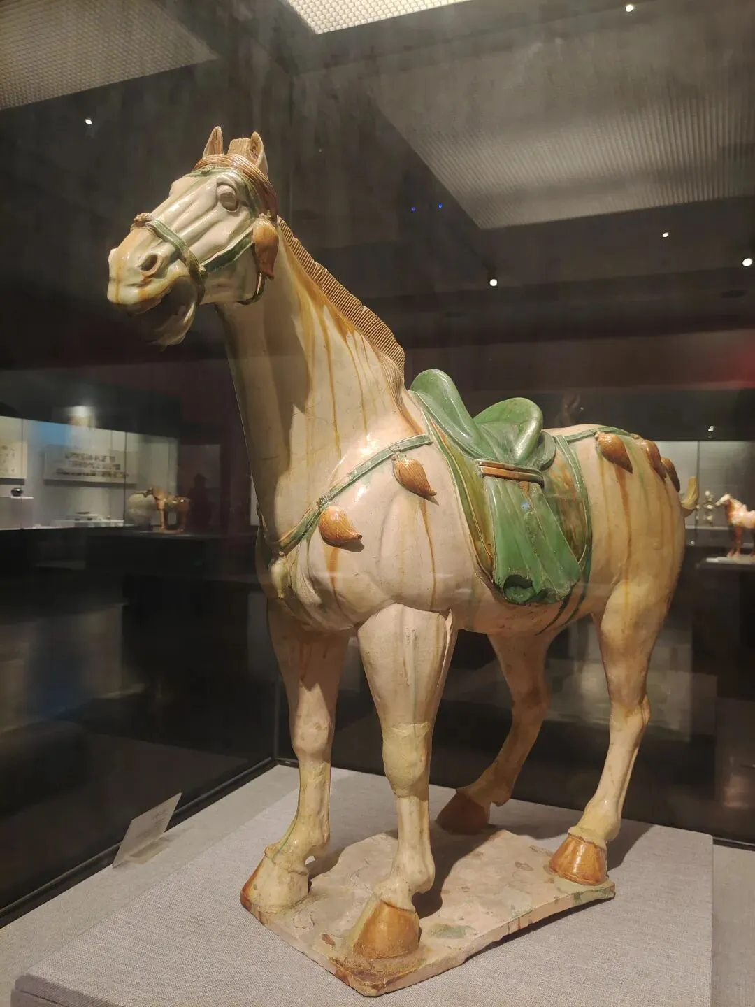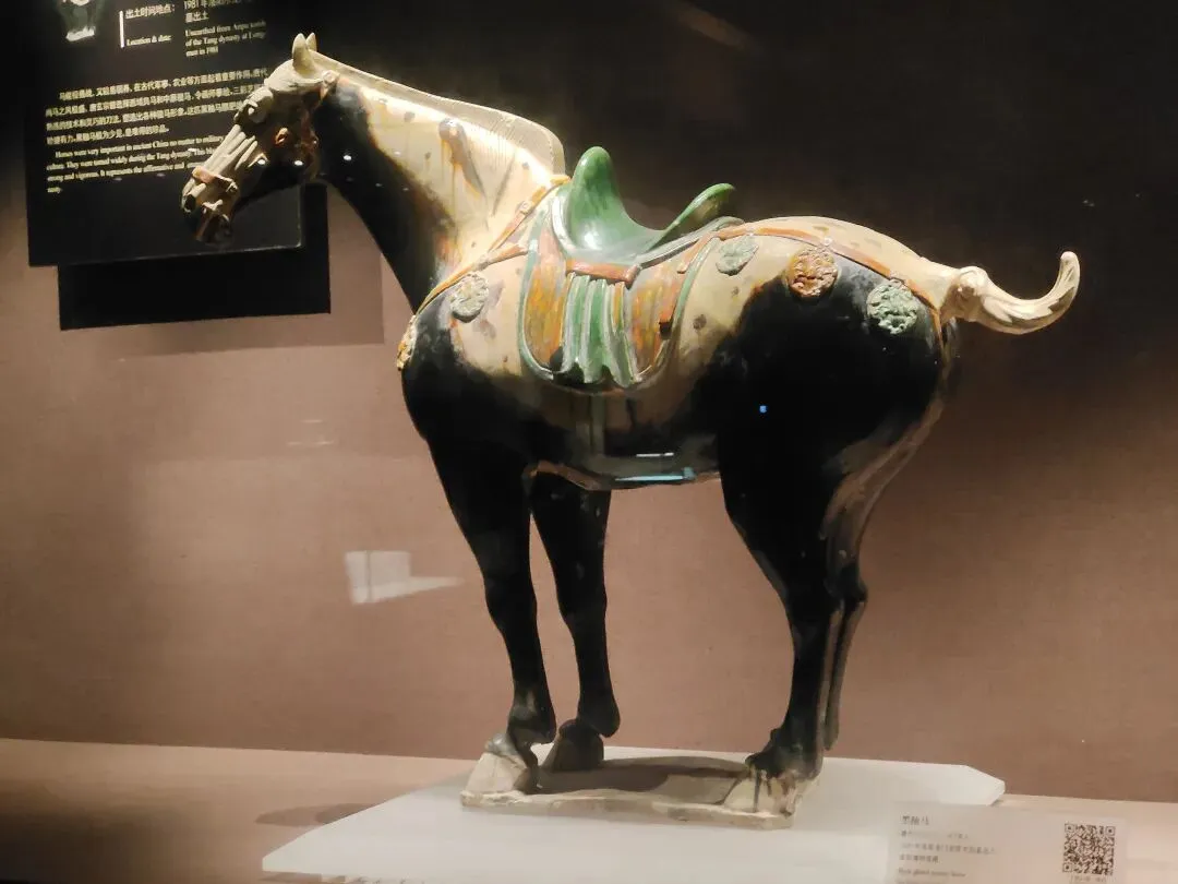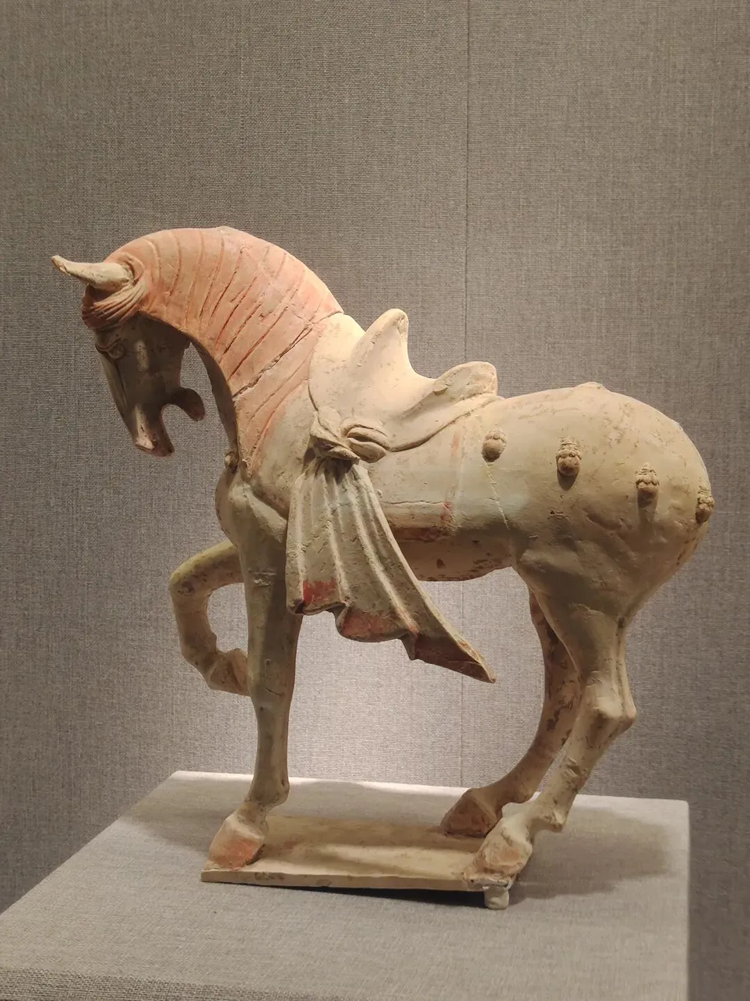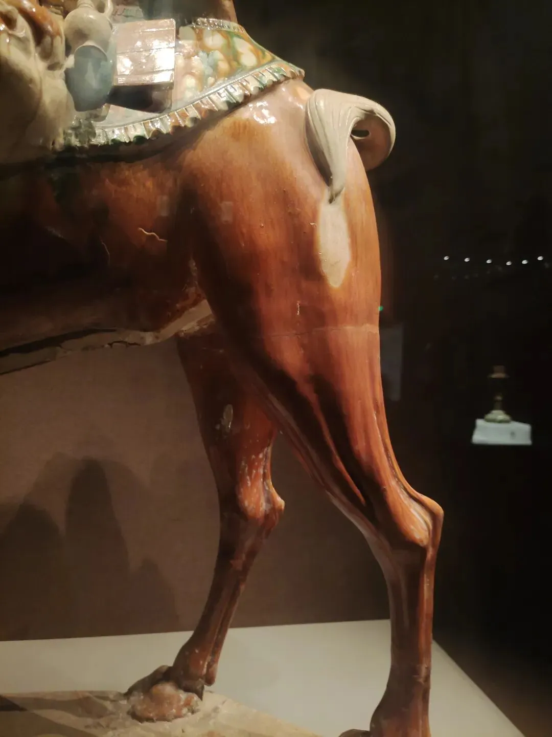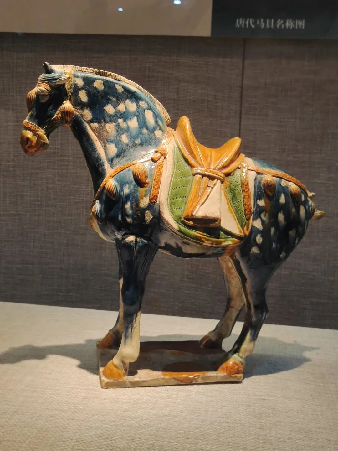 关于这件文物,网图大多是左侧(安好没碎的那一侧)的视角。确实是很精彩一匹唐马,马头高,马身壮,塑有鞍辔,右蹄抬起、三蹄着地,似在舞蹈:看展仔细的我,也有从它的右侧(事故、碎了断了的那一侧)拍照。从这边可以更清楚地看到马腿、脖子等部位多处粘合的痕迹: