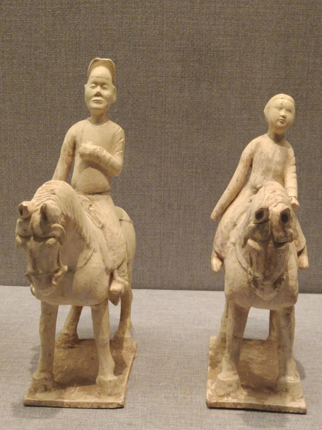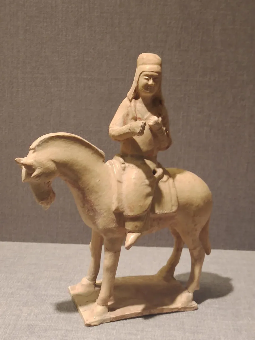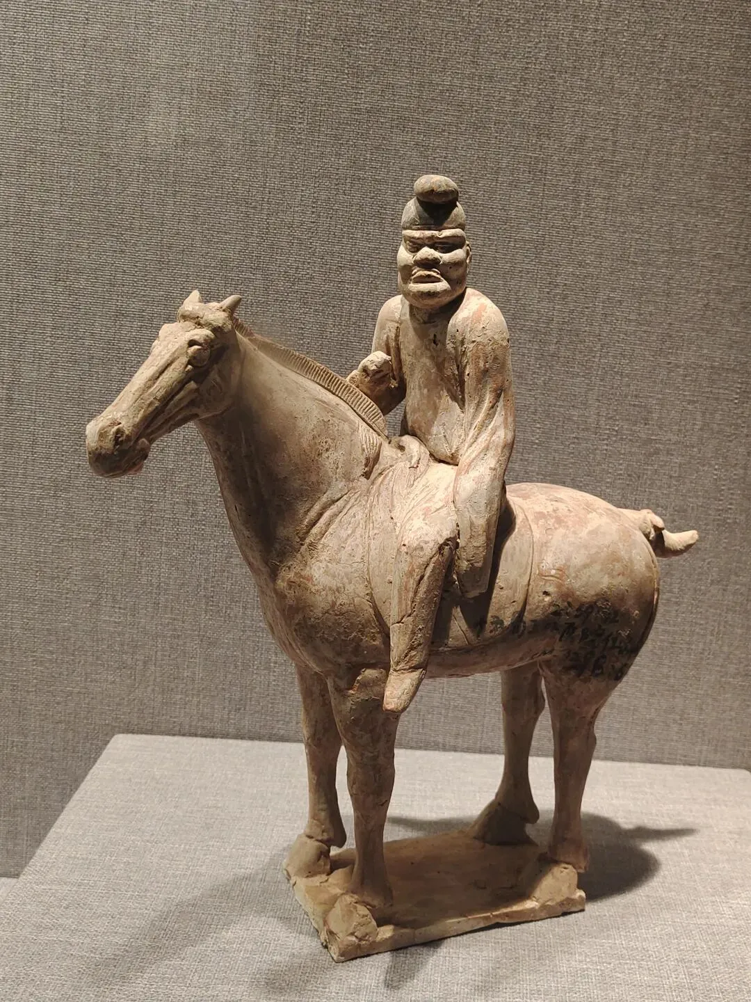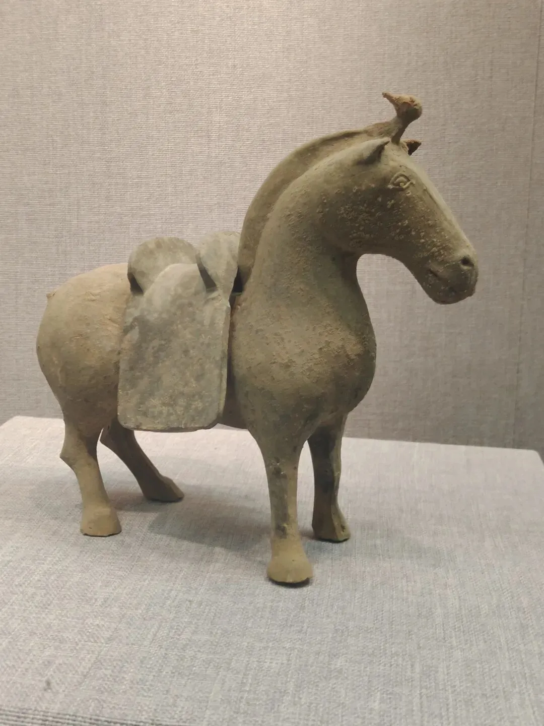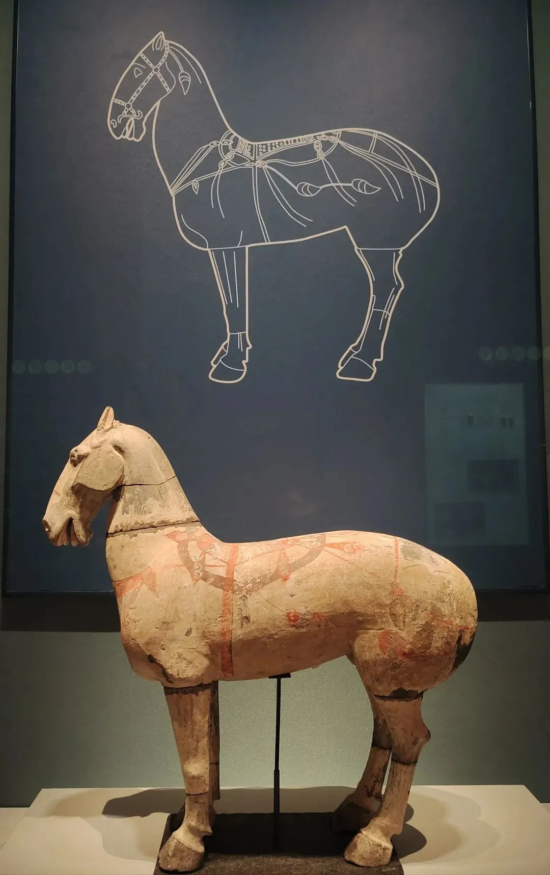 关于这件文物,网图大多是左侧(安好没碎的那一侧)的视角。确实是很精彩一匹唐马,马头高,马身壮,塑有鞍辔,右蹄抬起、三蹄着地,似在舞蹈:看展仔细的我,也有从它的右侧(事故、碎了断了的那一侧)拍照。从这边可以更清楚地看到马腿、脖子等部位多处粘合的痕迹: