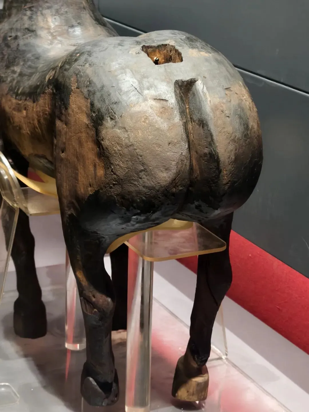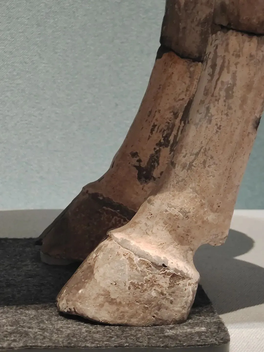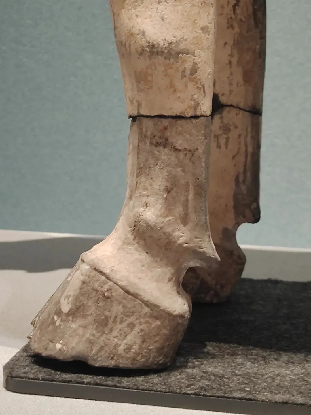 2025年4月17日。重庆中国三峡博物馆。开州红花村墓地出土东汉铜马,有支撑架具。香山汉墓西汉彩绘陶马。也是断腿粘合,比洛阳博物馆的唐马岁数也就大了个七八百岁吧。陈列时候马腹部有金属支架撑着:断肢粘合处,痕迹非常明显。简直是布展人在指着这些痕迹给我们看展人说:看到了?这里有伤有缝,所以不能承重,晓得哇?所以马肚子下边要用架具支撑: