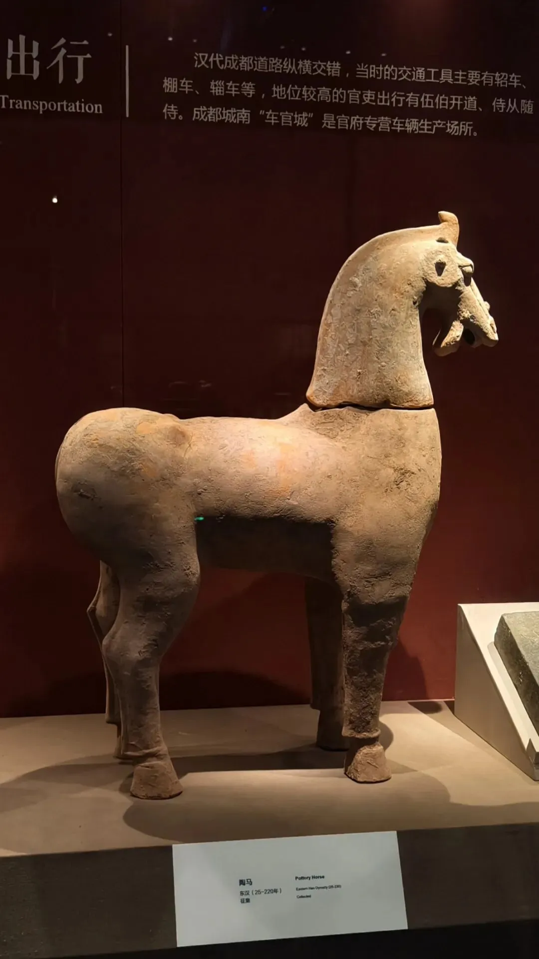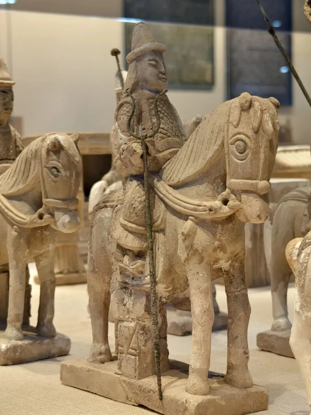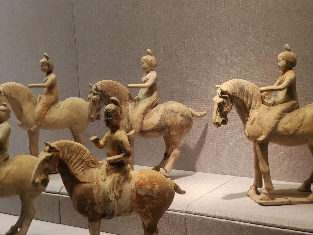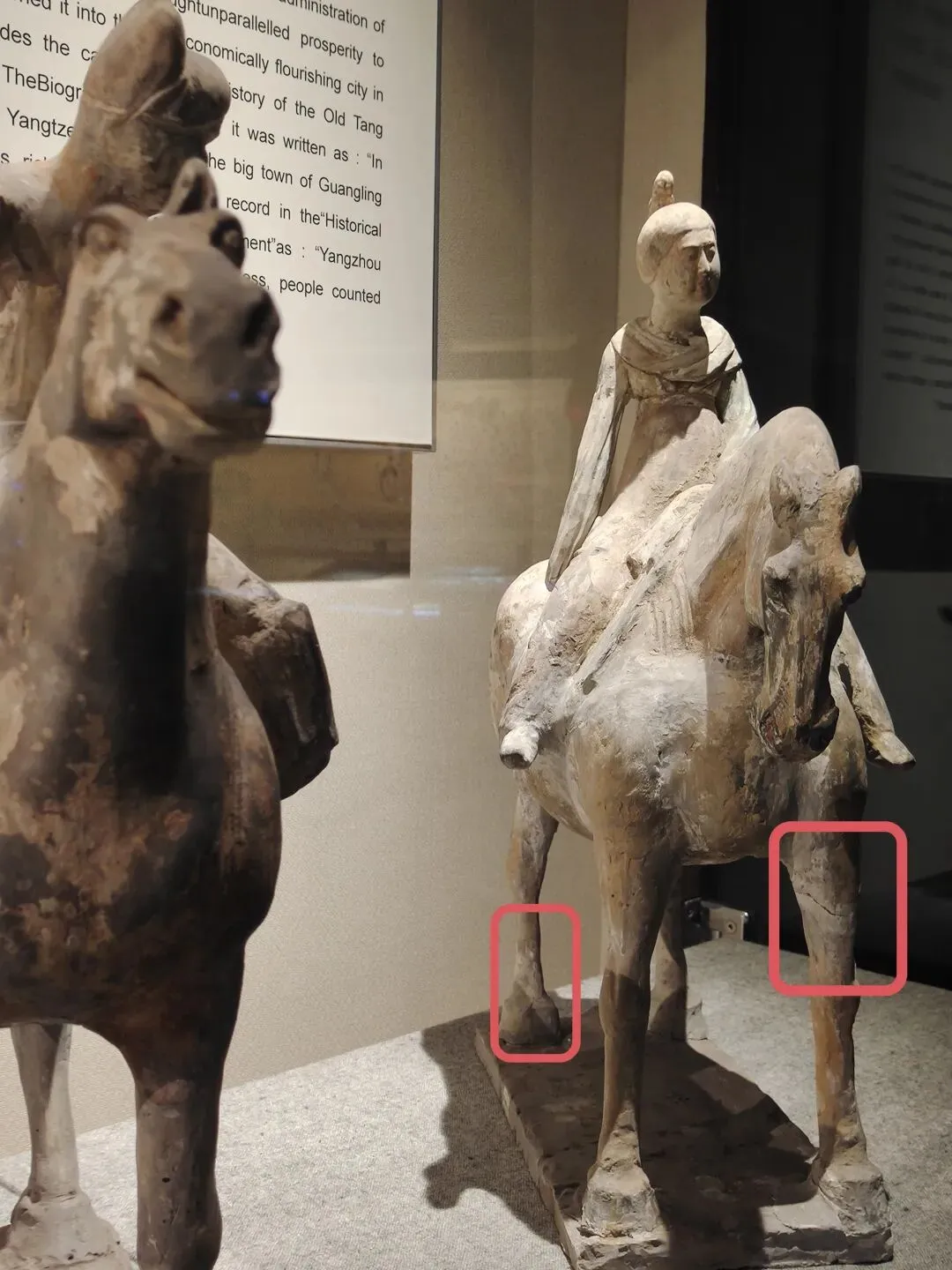 而且,青州博物馆的这个展柜里,还专门展了只有躯干没有腿的西汉彩绘陶马。我看展的当场有拍过小视频,絮絮叨叨讲道理。我晓得的哇~有朋友说:是不是因为成都、重庆在地震带上,所以那里的博物馆更有防震意识呀?青州不在地震带上啊,人家布展的时候就是有那个安全意识。成都博物馆跟成都考古中心在同一个城市吧?2025年3月20日。成都博物馆的汉代陶马,腿明显也是断了粘合的,并没有支架支撑:2025年4月30日,重庆市铜梁博物馆。明代张文锦沈氏合葬墓石刻仪仗俑。这是石头的,马腿明显也有断了粘合的痕迹,并没有用支撑护具:陈列中让马靠着细细的带伤的腿自己站着,肥硕的肚子和屁股不架支撑护具,是多数博物馆的做法。2023年3月4日,江西省博物馆新馆的抬腿陶马,也是个舞蹈马。一样三条腿自己站着,没有支撑护具:2023年6月9日。荆州博物馆。八岭山连心石料厂一号墓出土随葬品组合,陶牛陶马俑。西晋。自己站着,没有支撑护具:2023年6月21日。扬州博物馆。唐代陶马。断腿粘合的痕迹件件都很明显。让它们自己站着,没有支撑护具:2023年6月24日。澳门博物馆。唐三彩陶马俑。自己站着,没有支撑护具:洛阳博物馆说他们启动了对展厅文物安全隐患的全面排查,“避免此类情况(再次)发生”。确实有必要啊。那么多粘合的陶俑,万一粘合剂都过期了......还有那个特别漂亮叮铃咣啷的东汉彩绘陶百花灯。摇钱树+风铃即视,这要是粘合剂失效了,那不得叮咣仓啷……🙈不敢想!马年将至,本来各家博物馆也都该盘点自己家的马文物了,大抵会办马文物专题展,马文物也会格外受到公众的关注。洛阳博物馆倒了一匹马,其他博物馆赶紧以此为鉴,马上自查。咱们赶紧的,支架护具该加就加,粘合剂过期失效的情况都仔细检查——这个工作量可以想象是非常非常大的!加油啊。当然,我们去看展的小老百姓也会尽心尽力仔细看,发现情况立刻报告,尽量防患于未然。总之,布展的、保管的、看展的,咱们各出各的力,一起保护好文物吧。比心~
