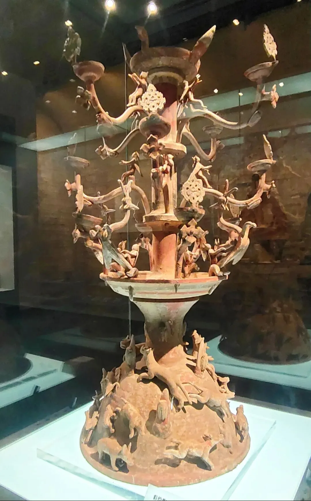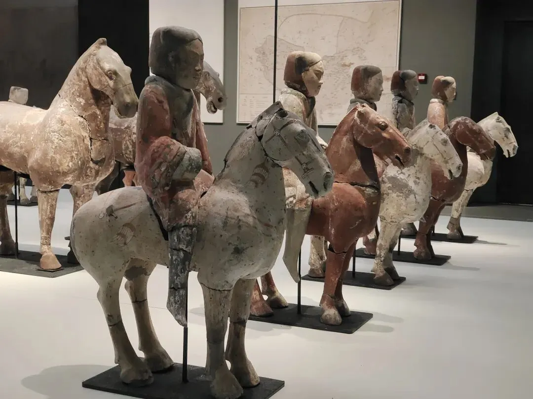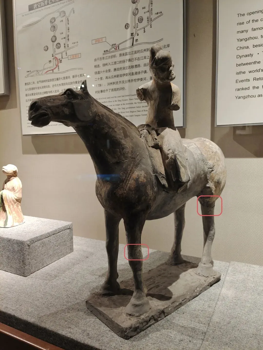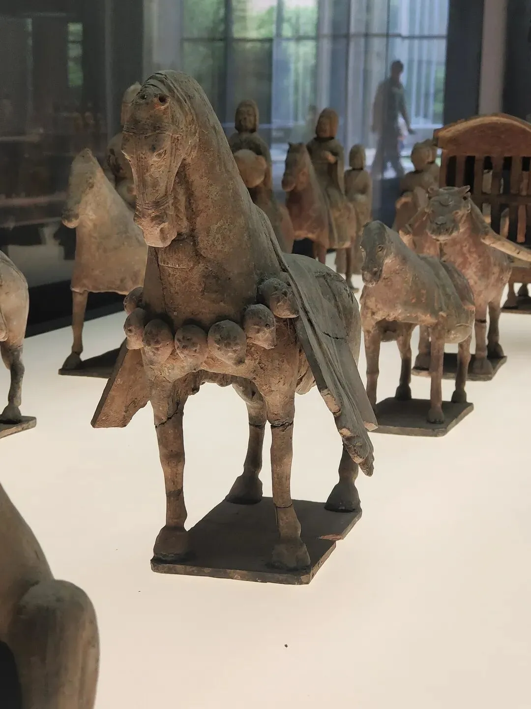 而且,青州博物馆的这个展柜里,还专门展了只有躯干没有腿的西汉彩绘陶马。我看展的当场有拍过小视频,絮絮叨叨讲道理。我晓得的哇~有朋友说:是不是因为成都、重庆在地震带上,所以那里的博物馆更有防震意识呀?青州不在地震带上啊,人家布展的时候就是有那个安全意识。成都博物馆跟成都考古中心在同一个城市吧?2025年3月20日。成都博物馆的汉代陶马,腿明显也是断了粘合的,并没有支架支撑:2025年4月30日,重庆市铜梁博物馆。明代张文锦沈氏合葬墓石刻仪仗俑。这是石头的,马腿明显也有断了粘合的痕迹,并没有用支撑护具:陈列中让马靠着细细的带伤的腿自己站着,肥硕的肚子和屁股不架支撑护具,是多数博物馆的做法。2023年3月4日,江西省博物馆新馆的抬腿陶马,也是个舞蹈马。一样三条腿自己站着,没有支撑护具:2023年6月9日。荆州博物馆。八岭山连心石料厂一号墓出土随葬品组合,陶牛陶马俑。西晋。自己站着,没有支撑护具:2023年6月21日。扬州博物馆。唐代陶马。断腿粘合的痕迹件件都很明显。让它们自己站着,没有支撑护具:2023年6月24日。澳门博物馆。唐三彩陶马俑。自己站着,没有支撑护具:洛阳博物馆说他们启动了对展厅文物安全隐患的全面排查,“避免此类情况(再次)发生”。确实有必要啊。那么多粘合的陶俑,万一粘合剂都过期了......还有那个特别漂亮叮铃咣啷的东汉彩绘陶百花灯。摇钱树+风铃即视,这要是粘合剂失效了,那不得叮咣仓啷……🙈不敢想!马年将至,本来各家博物馆也都该盘点自己家的马文物了,大抵会办马文物专题展,马文物也会格外受到公众的关注。洛阳博物馆倒了一匹马,其他博物馆赶紧以此为鉴,马上自查。咱们赶紧的,支架护具该加就加,粘合剂过期失效的情况都仔细检查——这个工作量可以想象是非常非常大的!加油啊。当然,我们去看展的小老百姓也会尽心尽力仔细看,发现情况立刻报告,尽量防患于未然。总之,布展的、保管的、看展的,咱们各出各的力,一起保护好文物吧。比心~