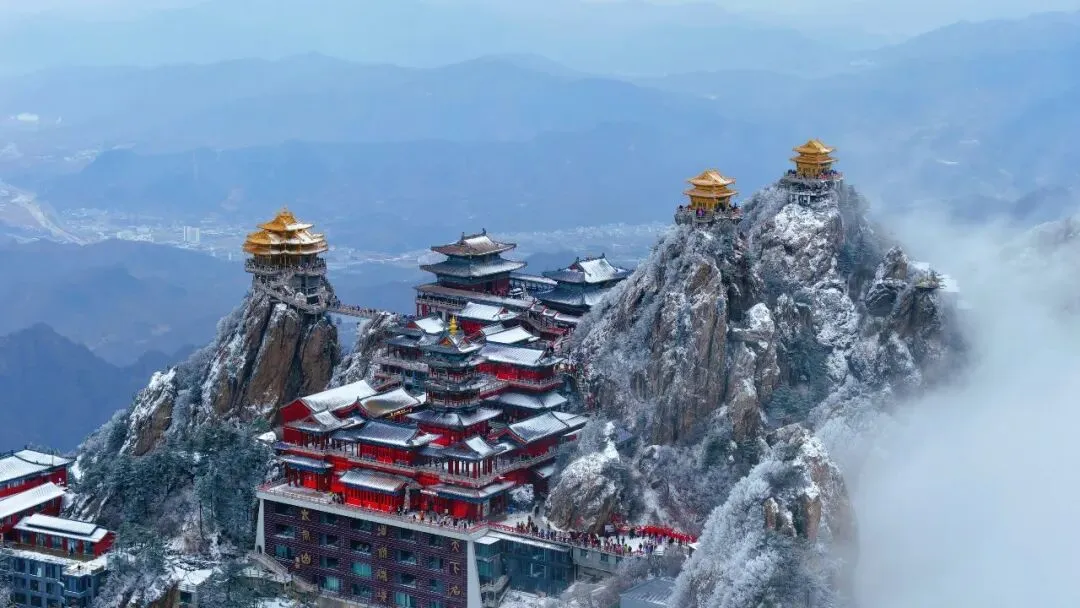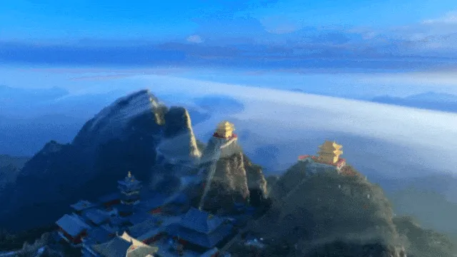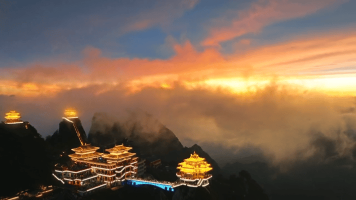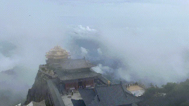 云海之中的金顶道观群,就像一座天上的宫殿,灵霄绛阙,琼楼玉宇,