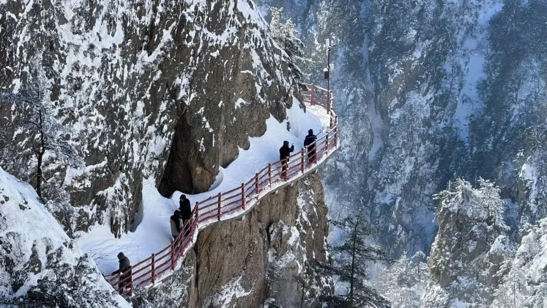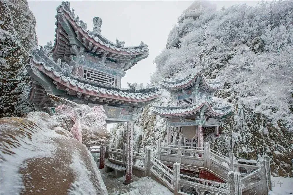古朴的道观建筑在白雪映衬下更显静谧庄严