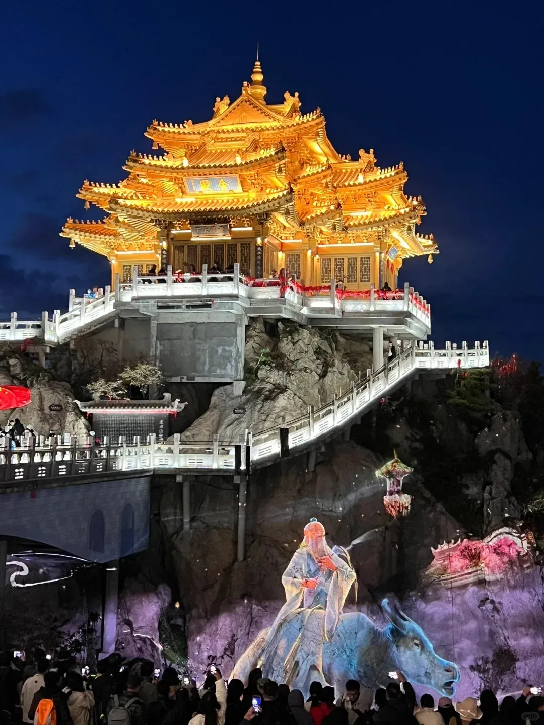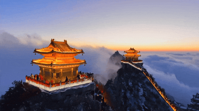 12:00乘坐索道上山(自理必消∶中灵/云景索道费用130元/人)。参观老君山景区,中天门、飞来石、传经楼、老君庙、十里画屏、金顶道观群,感受伏牛山第一峰气势雄伟,云海红叶、群峰竞争、千姿百态的自然生态现象。体验‘一览众山小’的意境,欣赏亮灯后乘坐索道下山。