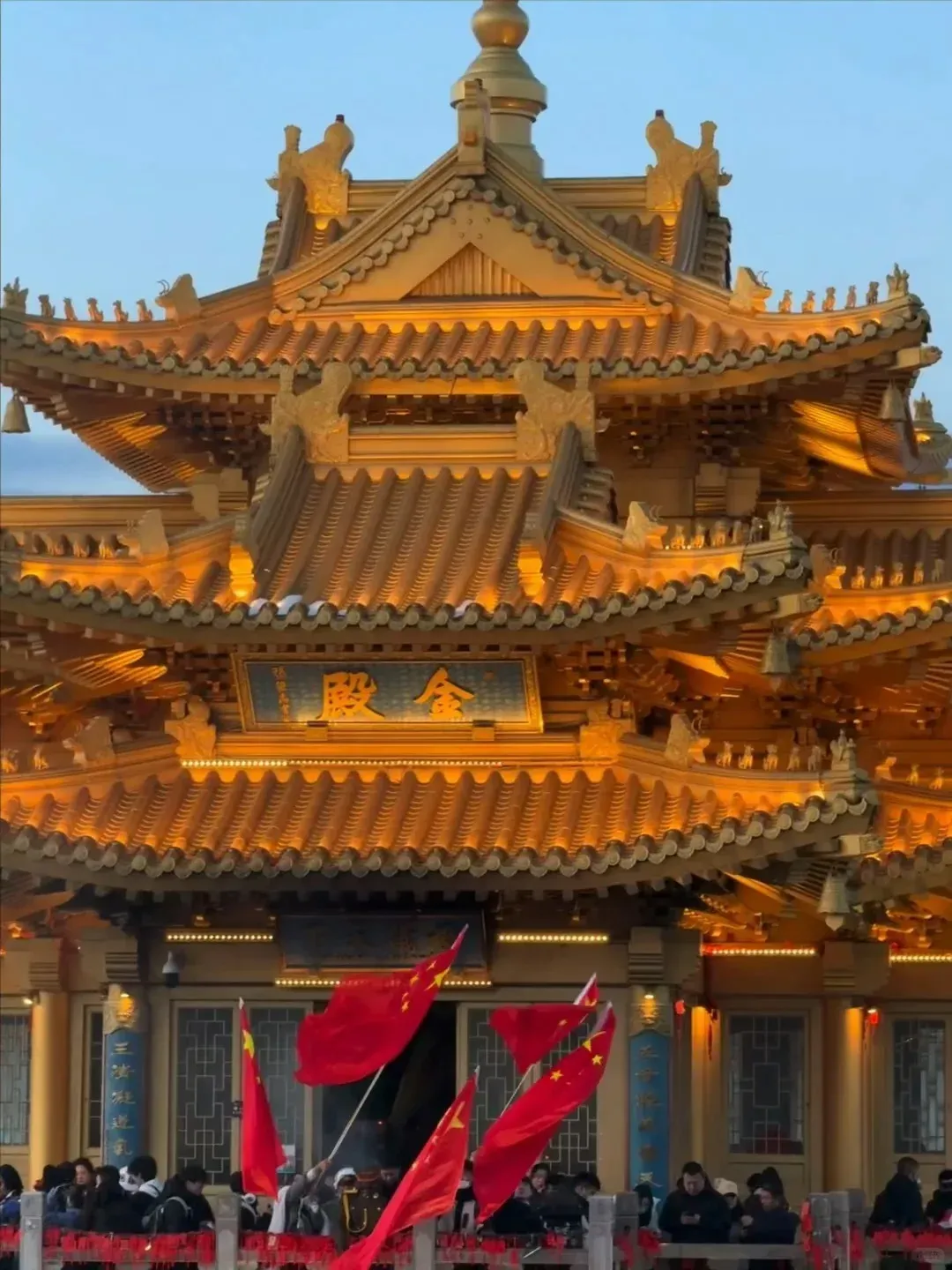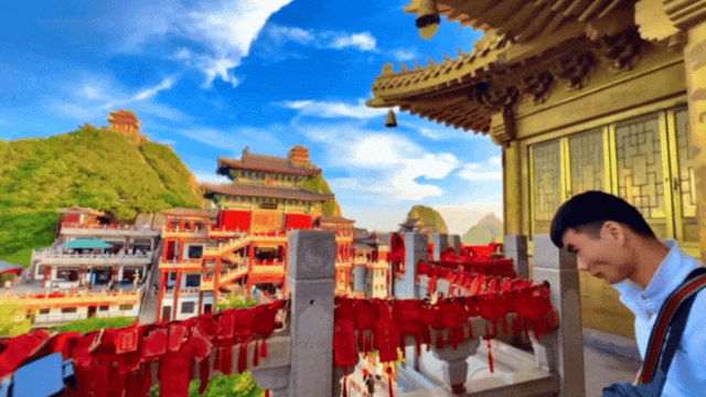 金殿是老君山整个游线的最后一站,这里共有三座金殿,分别是玉皇顶、亮宝台和五母金殿,其中尤以五母金殿的建筑最为恢弘大气,殿中因供奉五位女神而得名。该殿以纯铜打造,光是顶部的葫芦形宝顶就有3.6米高,整座金殿在阳光下熠熠生辉,让人不禁肃然起敬。到了金殿,别忘了挂一条平安带,刻一把同心锁,将你的心愿写下哦
