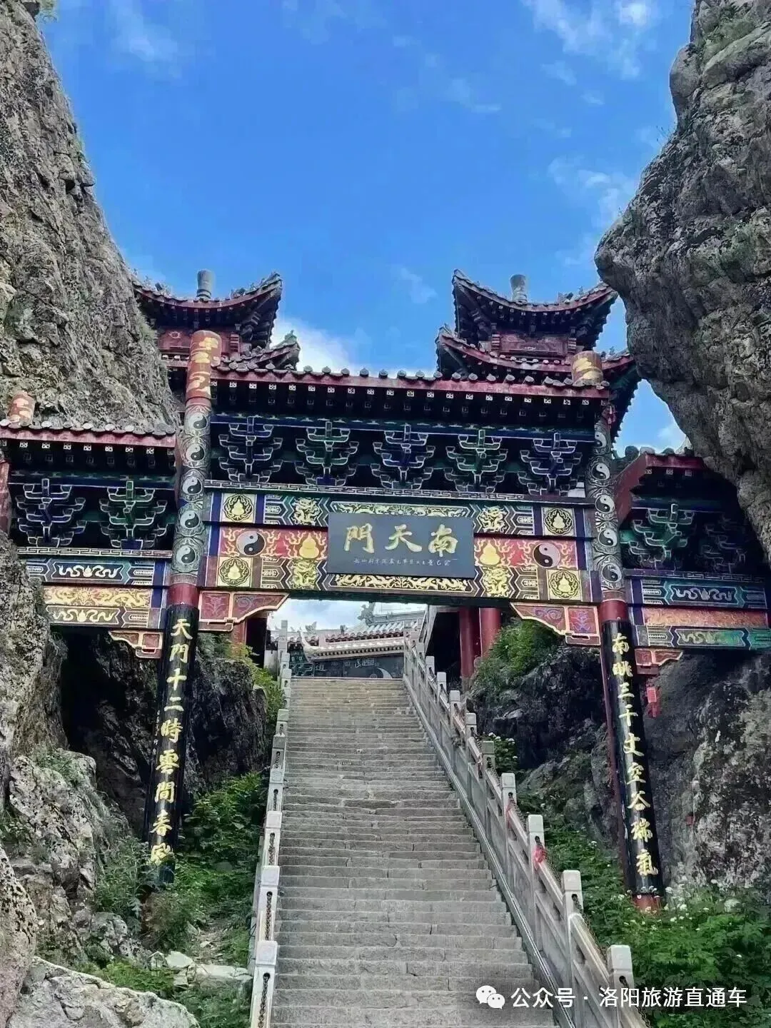 南天门,老君山的南天门利用优越的地理位置巧妙布局,充分体现了皇家建筑的规格。说起南天门,在中国古代宫廷建筑中都讲究坐北朝南,就连天宫也不例外,人们认为,南天门是进入天宫的主要通道,道家则认为南天门是人和神仙的沟通之门。