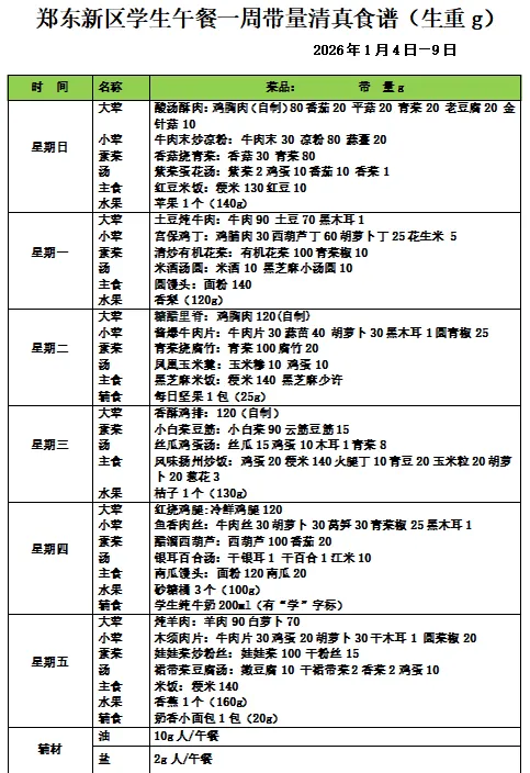 >郑州市郑东新区畅和街小学午餐一周(2026年1月4日——1月9日)食谱