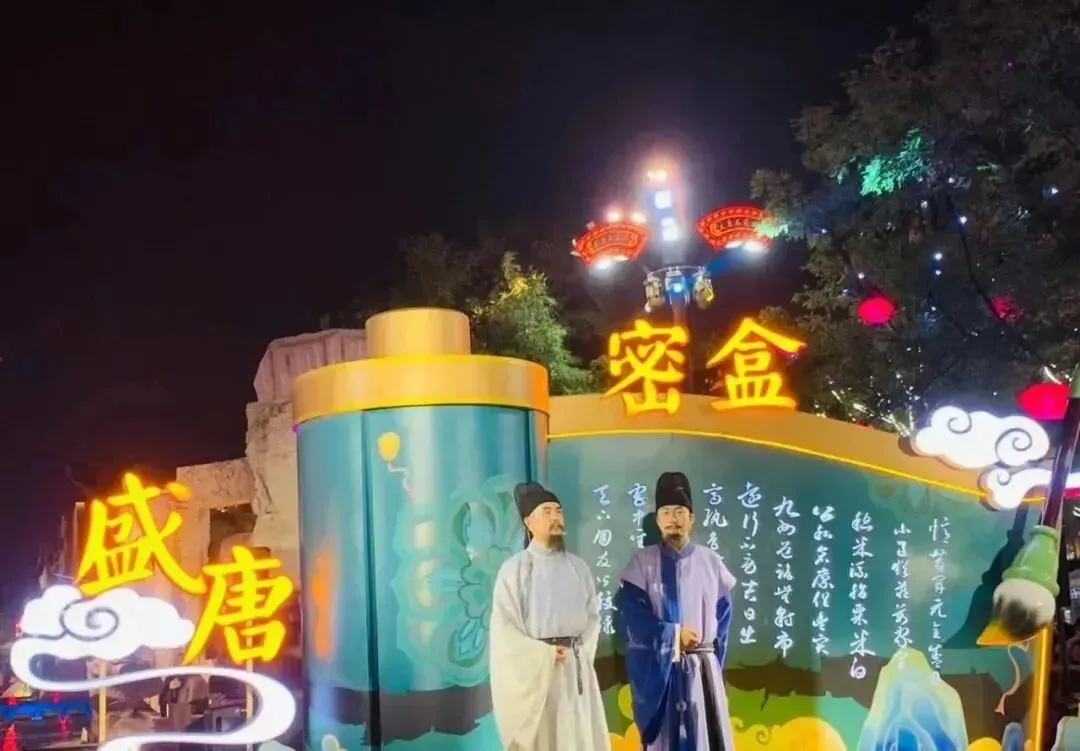 打卡爆火的“盛唐密盒”互动,与“房玄龄”“杜如晦”对诗答题,在灯光璀璨的天街感受“火树银花不夜天”的盛唐气象。