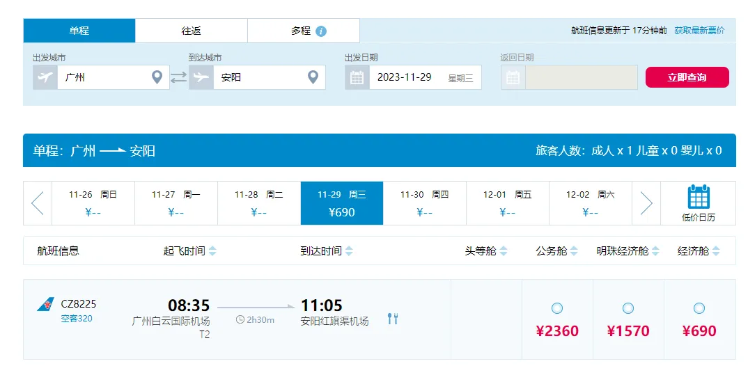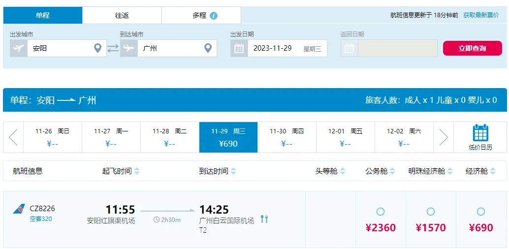 安阳至广州的航线票价已经公布。根据舱位、航班时刻和购票时间的不同,票价会有所差异。