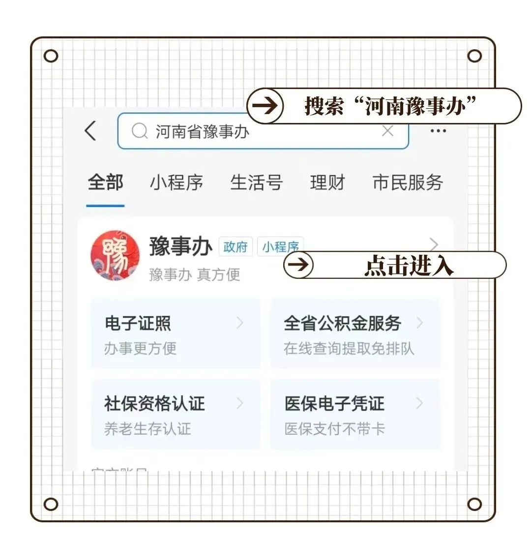 ①通过支付宝搜索河南省豫事办小程序,点击豫事办进入