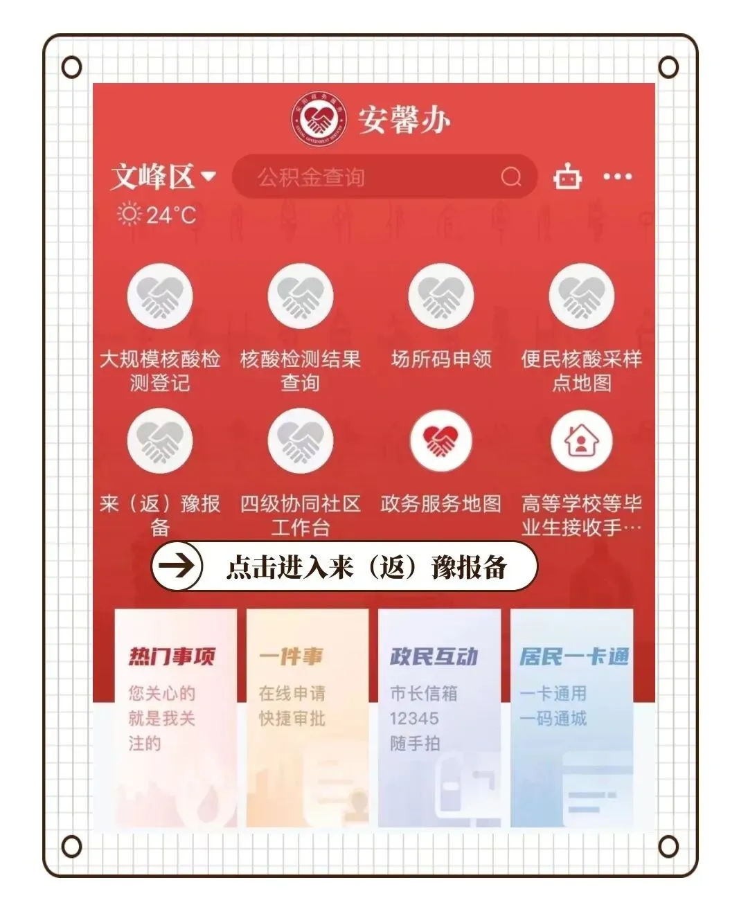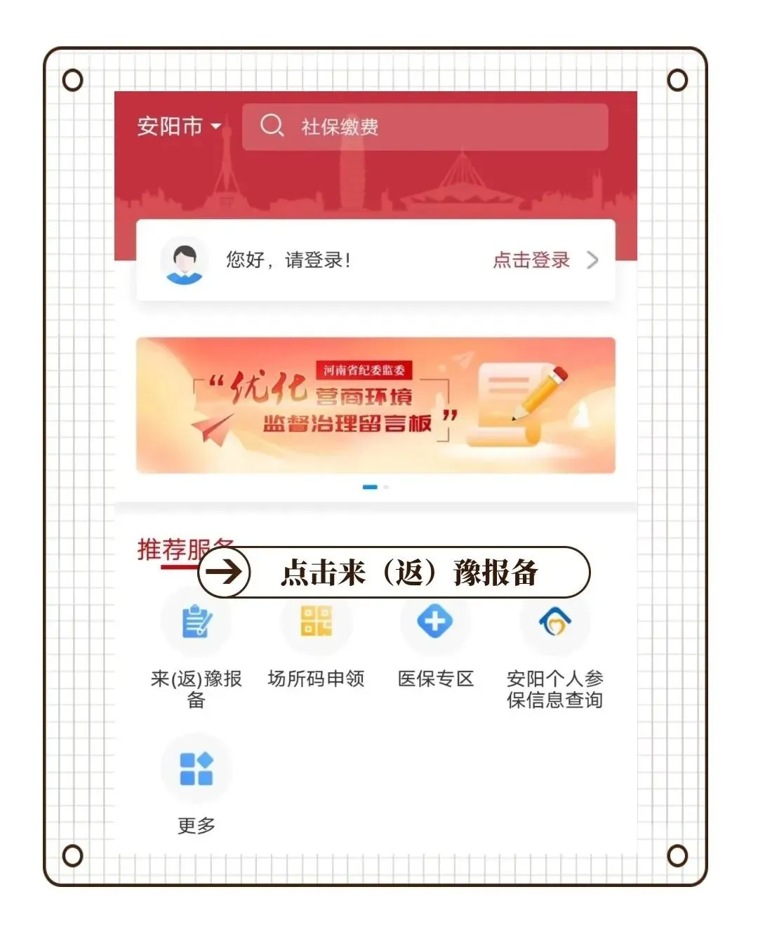 ②在安馨办APP中,点击来(返)豫报备按钮
