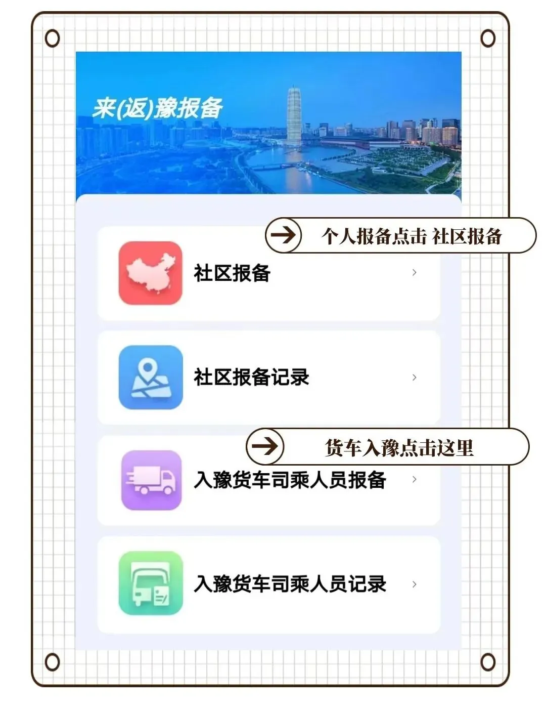 点击社区报备,如果是货车入豫点击入豫货车司乘人员报备