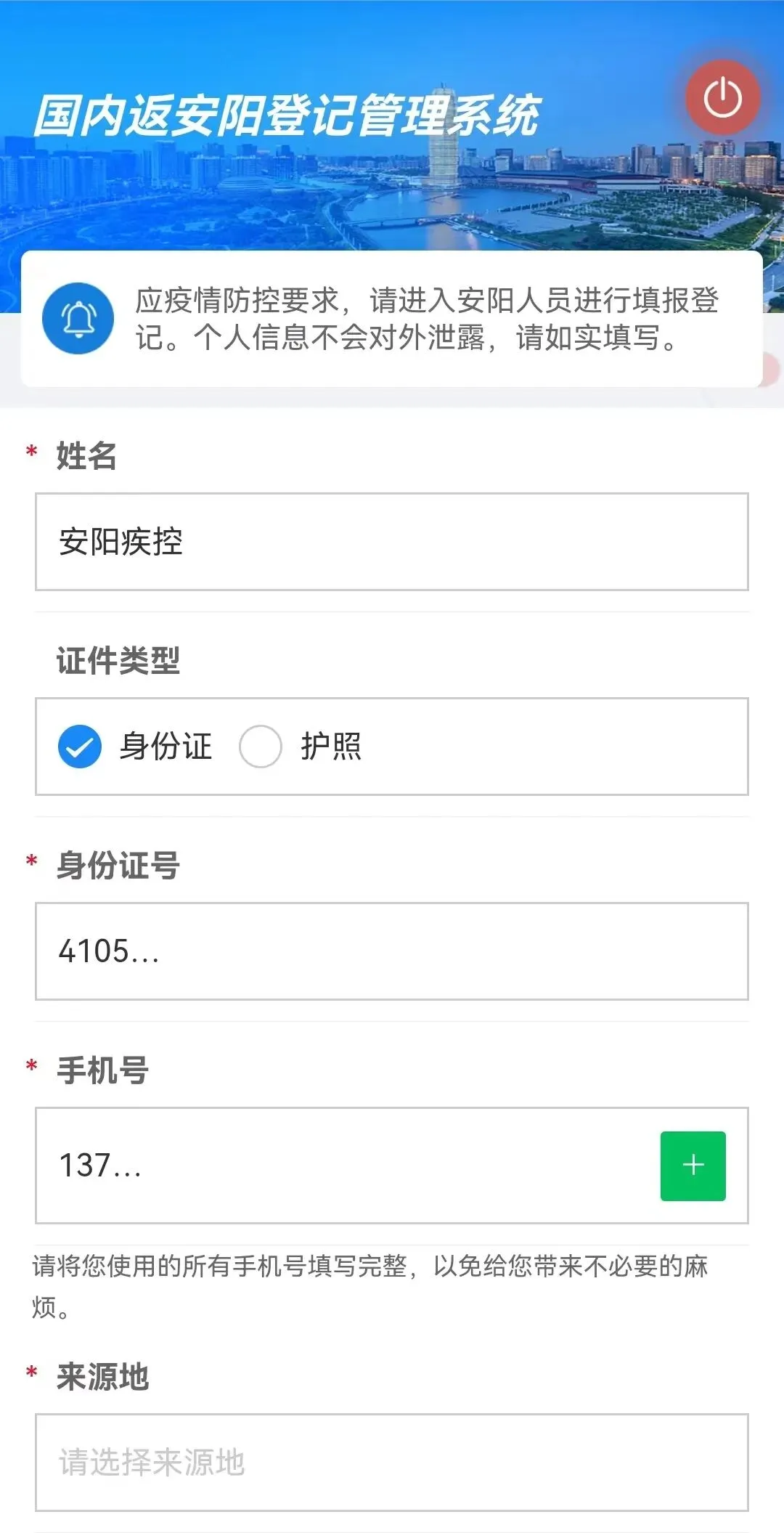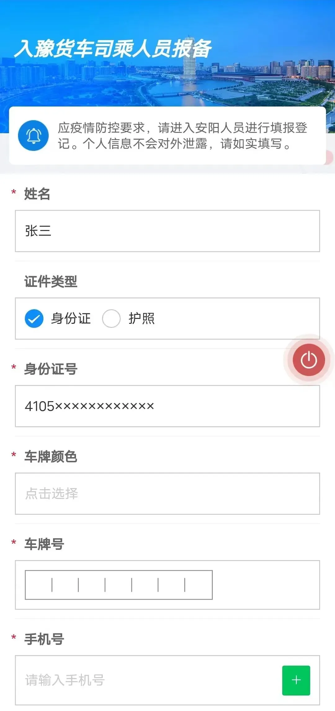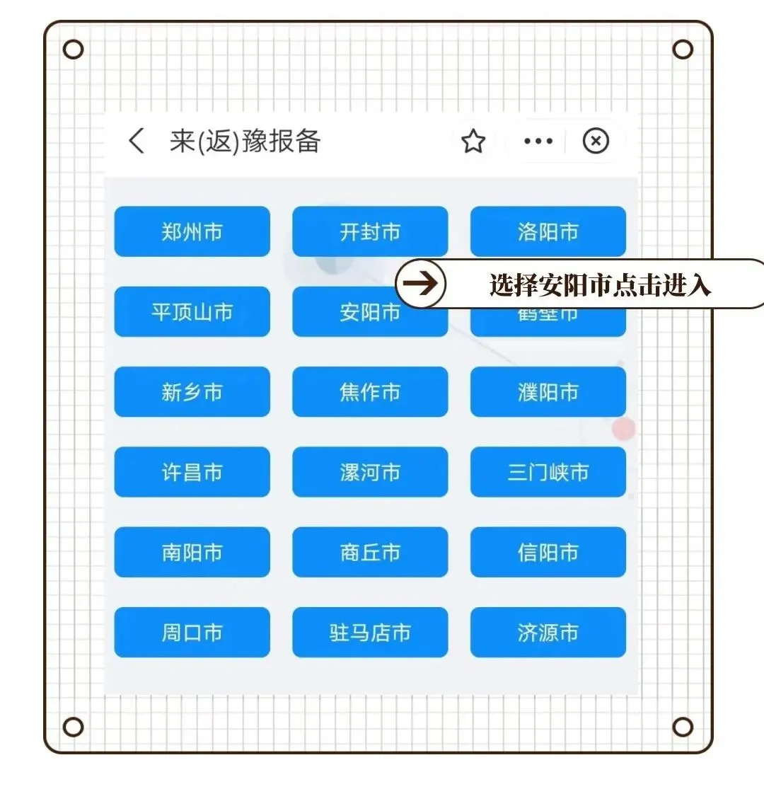 ④选择好社区报备或入豫货车司乘人员报备后,进入页面点击安阳市进入填报信息页面
