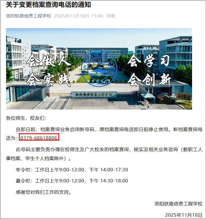 小招注意到,2025年11月18日,洛阳铁路信息工程学校发布《关于变更档案查询电话的通知》,其中提到:“原档案查询电话即日起停止使用。新档案查询电话为:0379-68618806“。而该号码,正是洛阳师范学院档案馆综合档案业务电话。(如下图,点击图片可放大)