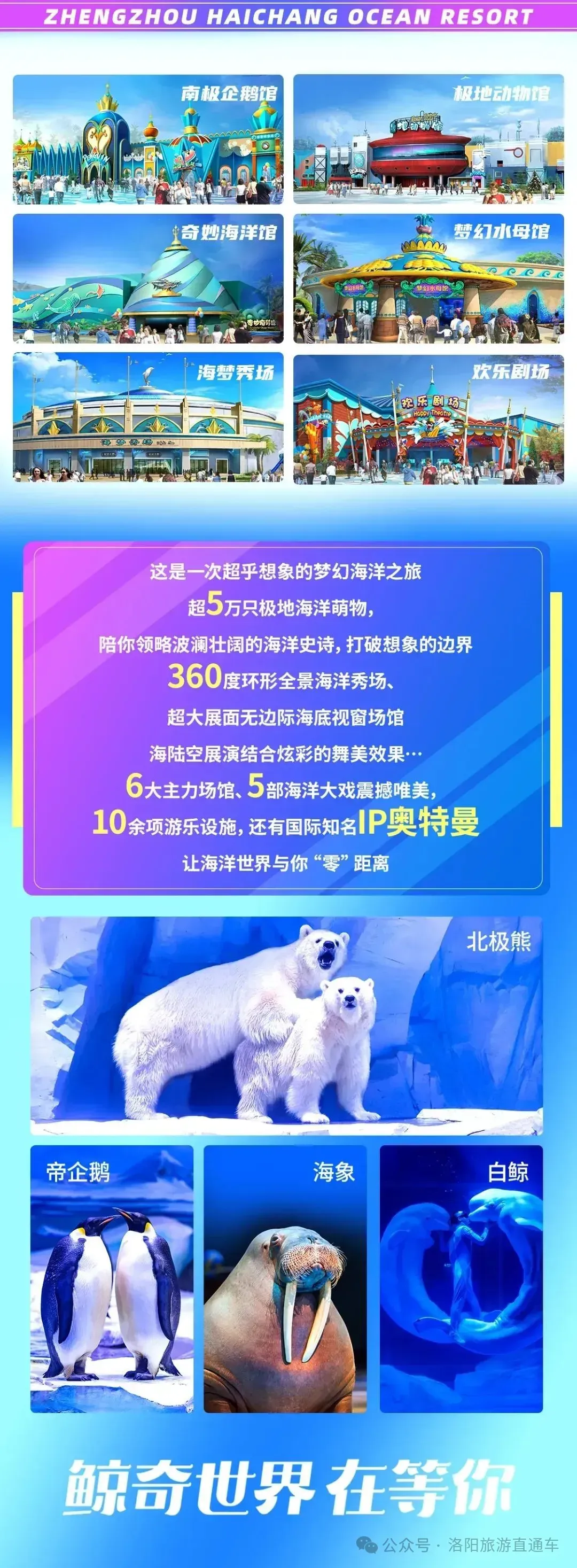 郑州海昌海洋公园邀你一起坠入这片梦幻欢乐的“海洋梦境”!奇妙海洋馆、极地动物馆等六大主力场馆,让你无限穿梭海底世界与冰封大陆;大型主题花车巡游、魔幻海洋动物秀等五部海洋大戏,一起沉浸声乐光影交织的欢乐派对;白鲸、北极熊、帝企鹅等超5万只极地海洋动物,陪你探索生命之源与环境保护的意义。还有奥特曼主题小镇等更多超级惊喜,无论男女老幼,都可以寻找属于你的那束“快乐之光”。