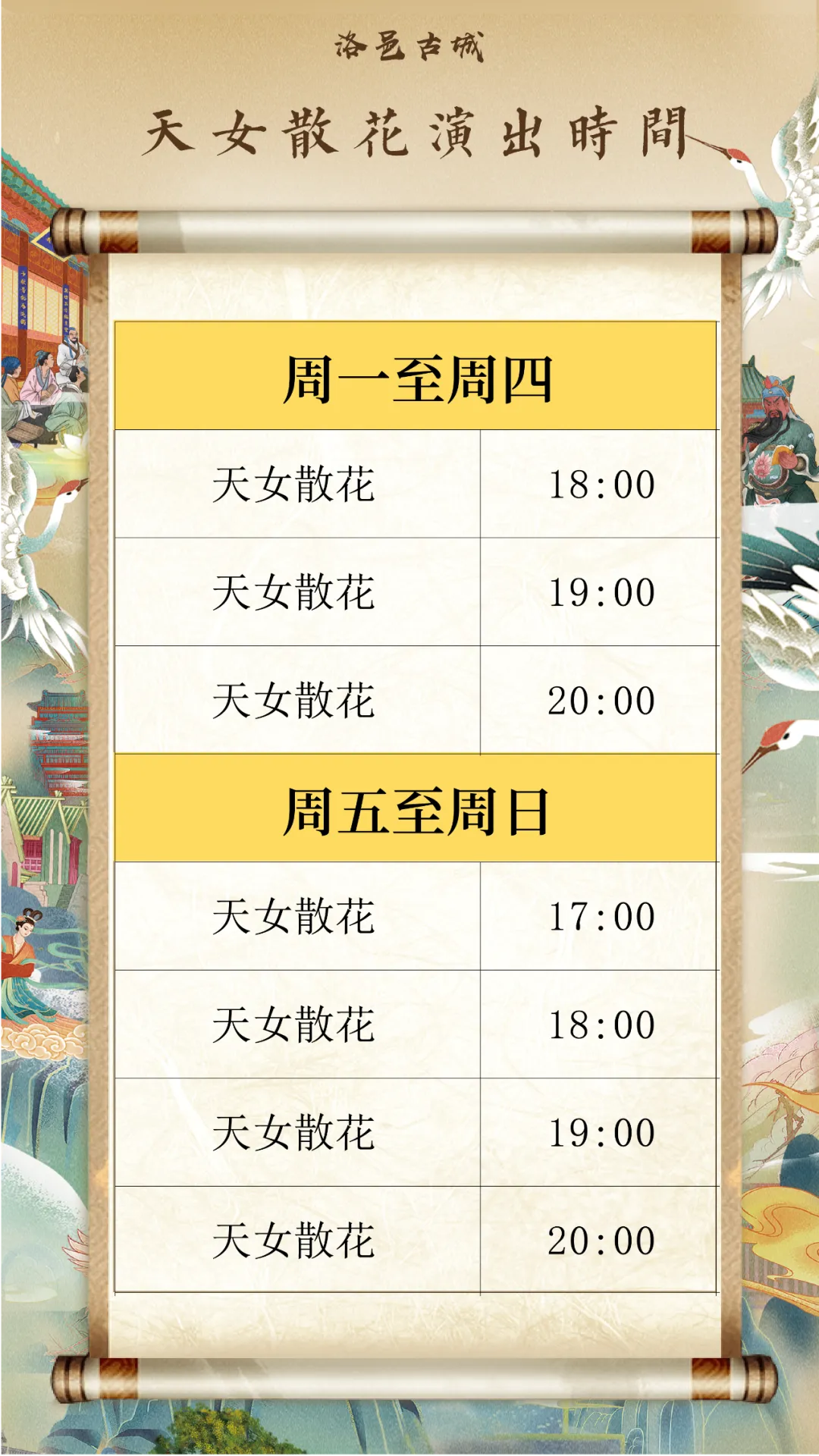 >【洛阳旅游】洛邑古城演出节目表(天女散花&天庭潮音)2026年