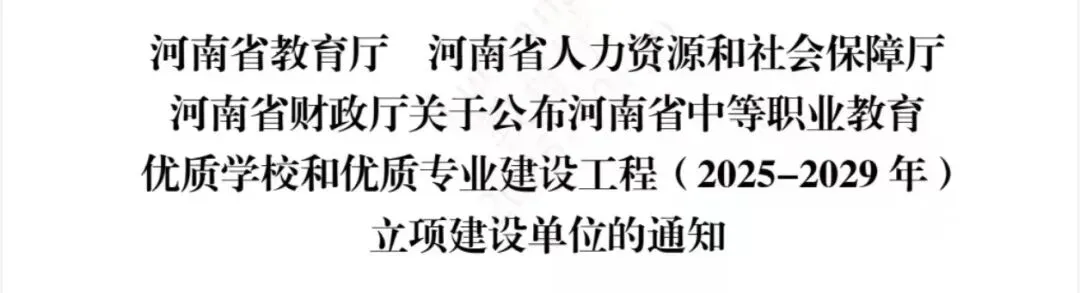 近日,河南省教育厅、河南省人力资源和社会保障厅、河南省财政厅公布河南省中等职业教育优质学校和优质专业建设工程(2025-2029年)立项建设单位名单,我校获批河南省中等职业教育优质学校(2025-2029年)立项建设单位,我校旅游管理、计算机应用两大专业群同步入选优质建设专业群名单。
