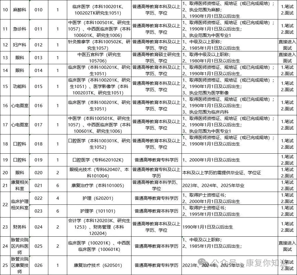 (1)报考医学类硕士研究生岗位及要求中级及以上职称本科岗位的考生,直接进入面试。(详见《岗位表》附件1)。