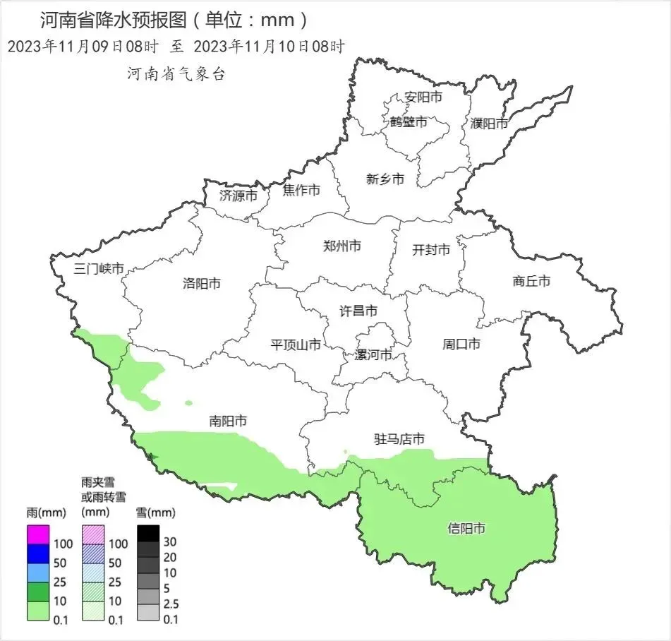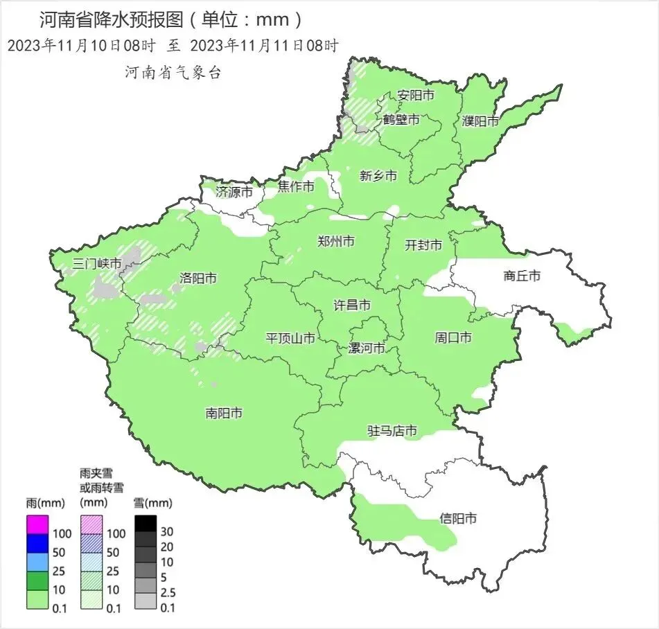 11月11日,黄河以南阴天,中西部有雨夹雪或小雪,南部有小雨或零星小雨;其他县市阴天转多云。全省偏北风3级到4级。