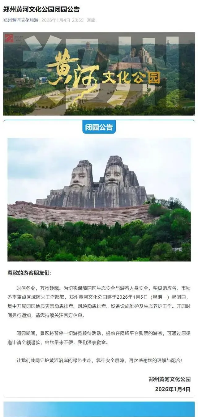 郑州黄河文化公园发布公告,为切实保障园区生态安全与游客人身安全,积极响应省、市秋冬季重点区域防火工作部署,郑州黄河文化公园将于2026年1月5日(星期一)起闭园,开园时间另行通知。