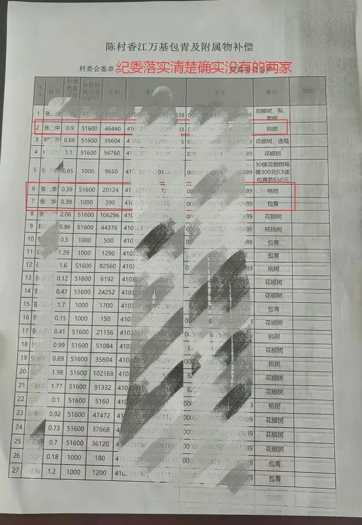 荒唐的是,张小刚手持的香江征地赔付明细表与实名检举信铁证如山,此次征地补偿名单里,一队队长张某花、二队队长张某忠赫然在列,分别登记1.37亩、0.9亩补偿面积,合计2.27亩补偿款尽数入账。经新安县纪委核查,这两名村干部根本无对应土地,所谓征地补偿纯属凭空冒领,而其冒领的亩数,与张小刚兄弟二人未获补偿的2.1亩近乎完全一致,如此精准的“数字巧合”,绝非偶然,分明是基层干部利用职权、监守自盗的恶意侵占!