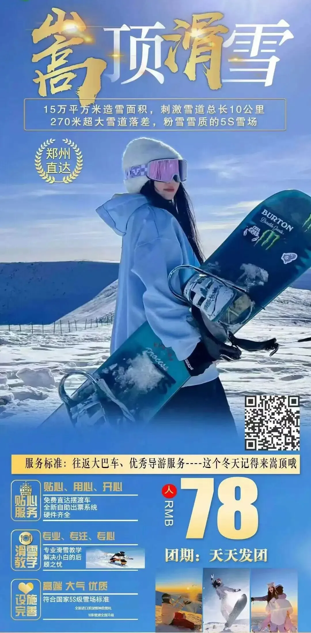 滑雪票及基础雪具 :景区门票、雪板、雪鞋、雪杖 。(可以提前含,日期不同价格不同,需要现询)