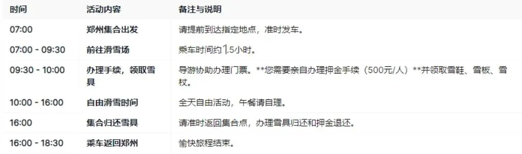午餐安排 :午餐需自理,可自带干粮或在雪场餐厅消费。