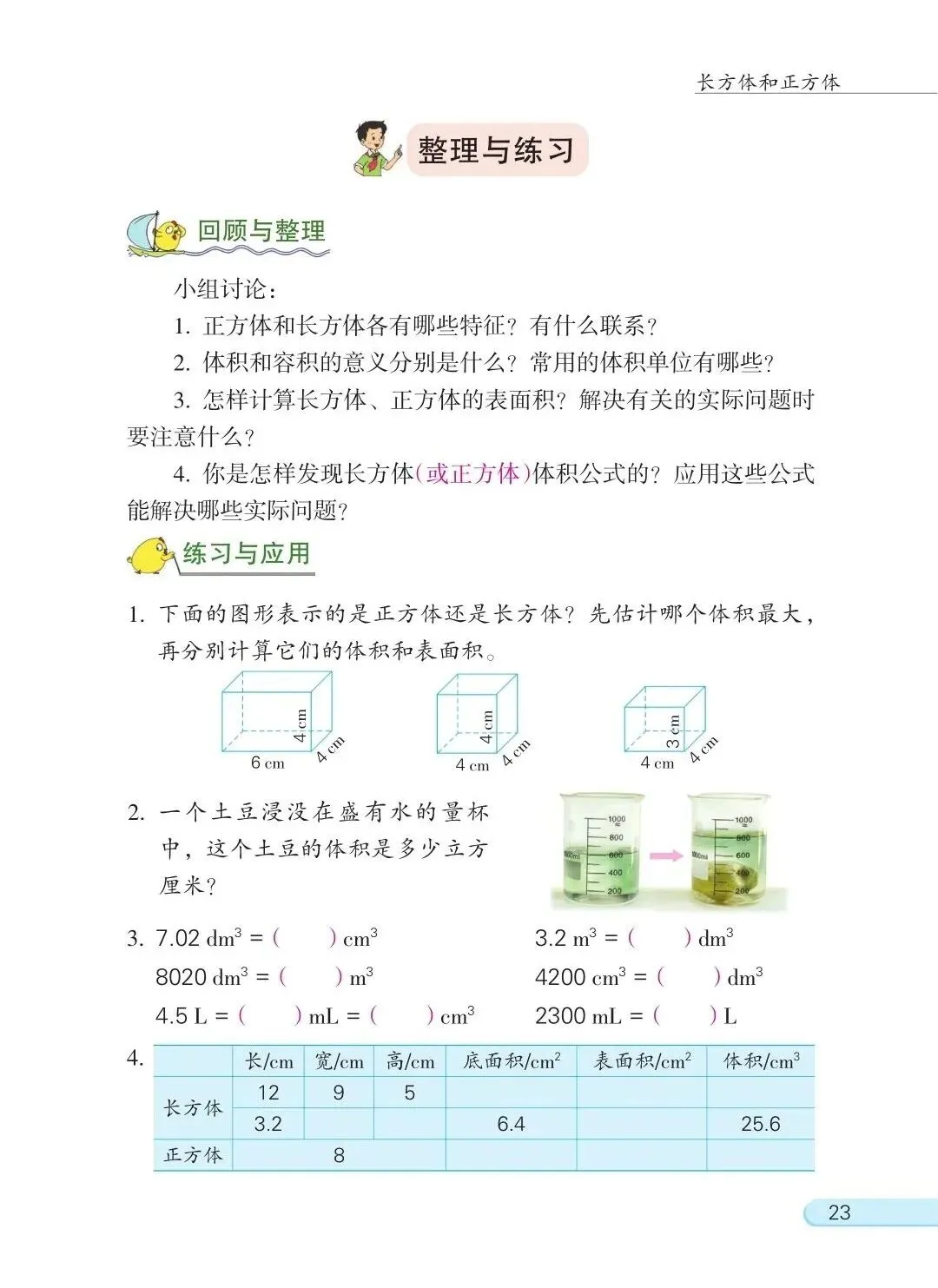 长方体和正方体体积复习课的核心目标是帮助学生梳理公式、夯实应用、查漏补缺,整节课围绕“公式梳理—题型巩固—错题突破”展开,课后结合学生表现,反思如下:1.知识梳理结构化:本节课我为学生搭建了清晰的知识框架,先引导学生自主回顾长方体、正方体体积计算公式及推导过程,明确体积公式与底面积、高的关联,打通“长×宽×高”“底面积×高”的内在联系。整合了“体积单位换算”“不规则物体体积测量”等相关知识点,帮助学生构建完整的知识体系,避免知识碎片化。2.练习设计分层化:设计分层练习,从基础的棱长求体积,到生活中水箱、包装盒的体积计算,再到稍复杂的拼切、排水法求体积,循序渐进提升学生应用能力,多数学生能熟练解决基础题型。基础题聚焦公式的直接应用,如已知长、宽、高求体积,已知棱长和及长宽求体积,夯实学生的计算能力;提升题侧重公式的逆用,如已知体积和长、宽,求高,锻炼学生的逆向思维;拓展题结合生活实际,如不规则石块的体积,让学生体会数学与生活的紧密联系,增强应用意识。3.注重实物演示,提升学生空间观念:在解决木料锯成两段,表面积增加48平方分米的练习题时,通过模型演示、画图,让学生的空间观念逐步得到提升。对于不规则物体体积的测量,强调“排水法”的核心原理——物体的体积等于排开液体的体积,课堂上通过现场演示,帮助学生理解方法背后的逻辑----上升部分水的底和容器同底。1.学生审题不够细致,常忽略单位不统一、求容积与体积的区别等细节,导致计算失误;2.小组交流不够深入,优等生主导讨论,学困生参与度低,未能实现全员互助提升;课堂上的小组讨论多集中在基础题的解答上,对于拓展题的探究不够深入。部分学生在讨论中处于被动参与的状态,缺乏主动思考和表达的机会,对小组讨论的指导和反馈也不够及时,未能充分发挥小组合作的优势。1.后续教学中需加强分层辅导,为学困生单独讲解拼切、排水法的解题技巧,强化单位换算和审题训练;2.设计更具趣味性的实践题,让学生在动手操作中深化理解;优化小组合作模式,明确分工,确保每位学生都能参与思考与表达。3.聚焦易错点专项训练:针对单位换算这一易错点,设计专项练习,明确不同单位之间的进率,强调“先统一单位,再计算”的解题规范。同时,整理学生的典型错题,进行集中评讲,分析错误原因,帮助学生规避同类错误。 在今后的复习教学中,要更加关注学生的实际学情,精准把握知识的重难点和易错点,设计更具针对性的教学活动,切实提升复习课的效率。复习课的意义不仅在于巩固知识,更在于促进学生思维的深化与能力的迁移。面对学生在单位换算、模型抽象、综合应用等方面的困难,教师需从真实情境出发,通过动手操作、任务驱动、分层支持等策略,帮助学生在理解中建构、在应用中内化。未来的教学应更加注重学生的主体参与,将复习过程转化为自主探究、合作反思的学习历程,真正实现“温故而知新”,让数学核心素养在复习课堂中扎实生长。